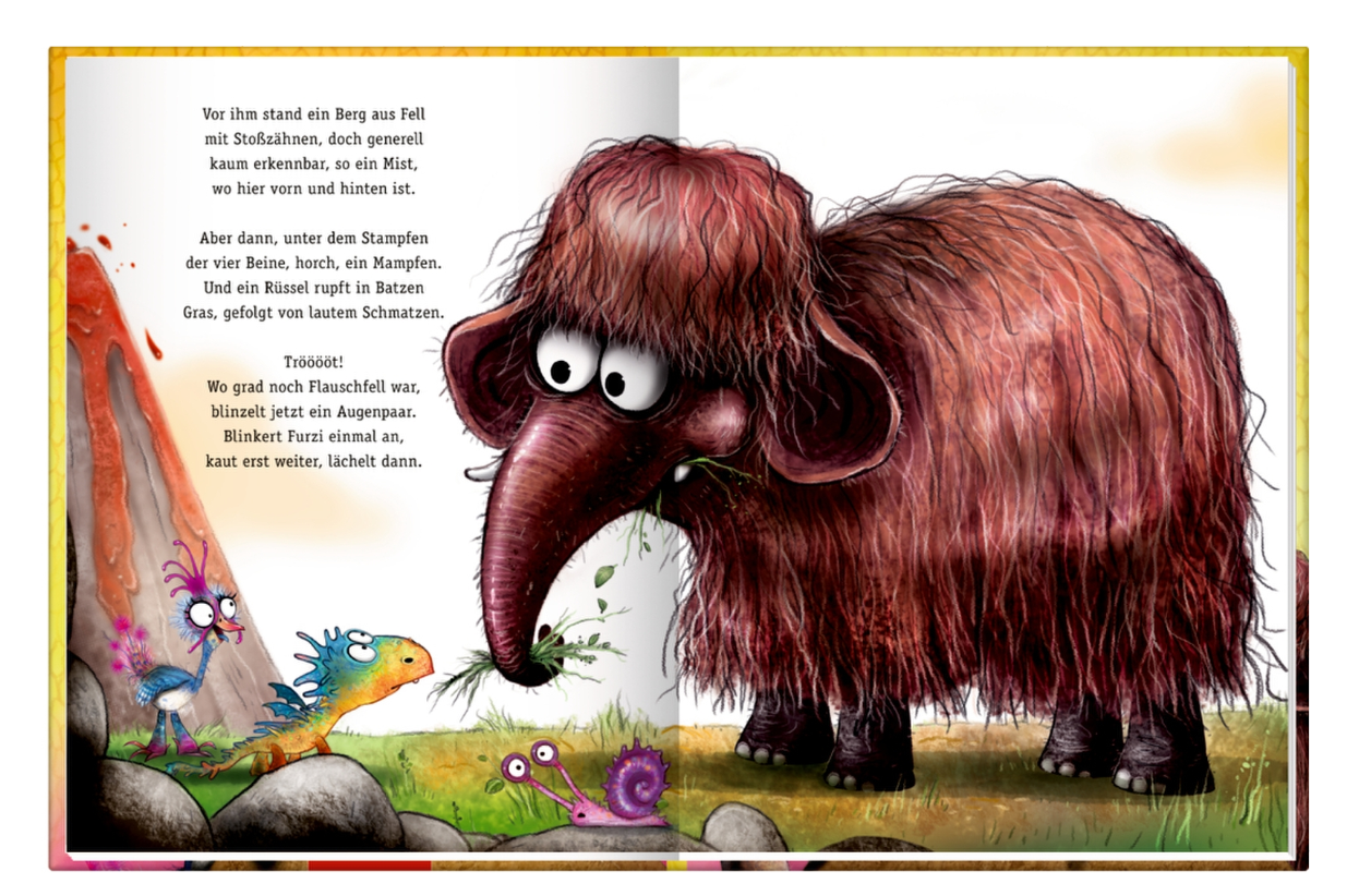 Oh, welch Ruhe, hört doch mal! Da vor uns das Drachental liegt im frühen Dämmerlicht. Es furzt, es hickst und hämmert nicht. So wie es die Alten wollen. Doch! Von ferne naht ein Grollen ... Und – BÖÖÖÖRPS – zerreißt ein Rülpser die Stille! Hinter dem Vulkan steht ein großes felliges Etwas mit Stoßzähnen. Das ist Rüdiger Rülps-Rüssel und er hat Hunger. Gewaltigen Hunger! Ob Furzipups das Drachental vor diesem nimmersatten Trampeltier retten kann?