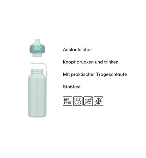Drücken und trinken, das ist das Prinzip der auslaufsicheren Pop-Up-Trinkflasche. Drücke auf den Trinkverschluss und die Flasche ist geöffnet, drücke noch einmal und sie ist geschlossen. Sehr praktisch während aktiver Momente und für einen schnellen Schluck zwischendurch. Oder um sie einfach zur Schule mitzunehmen! Die Campus Pop-Up-Trinkflasche hat eine praktische Schlaufe, mit der du sie mühelos mitnehmen kannst. Natürlich darf die Flasche nach Gebrauch in die Spülmaschine.