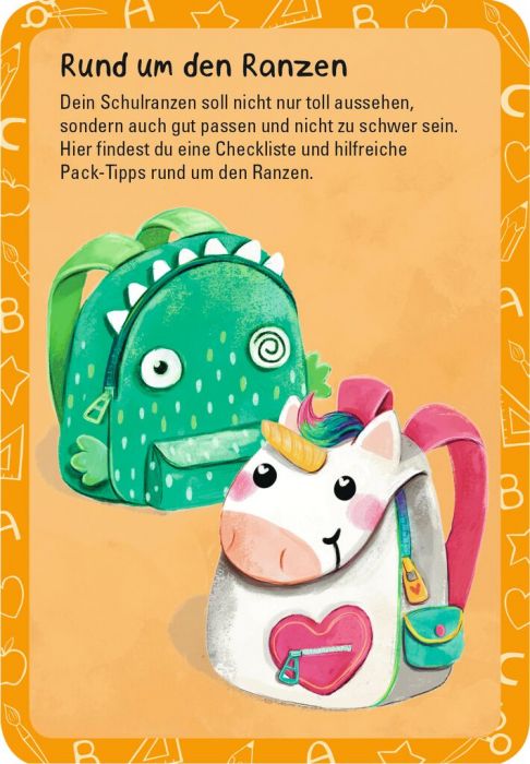 Für Schulkinder und alle, die es bald werden: 50 tolle und hilfreiche Ideen rund um den ersten Schultag, die Einschulung und den perfekten Schulranzen begleiten den Schulanfang. Kreative Bastelideen, erste Schreibübungen und lustige Spielideen ebenso wie nützliche Tipps für stressfreie Schultage, einen sicheren Schulweg und neue Freundschaften finden sich in der Box für Vorschulkinder und Erstklässler*innen. Das Kartenset ist das perfekte Geschenk für die Schultüte.