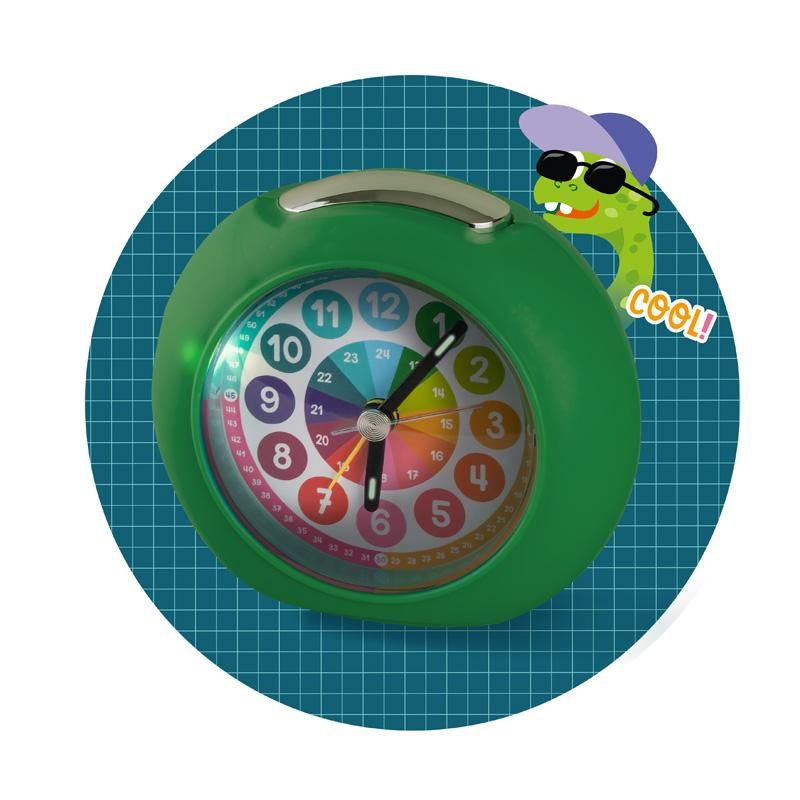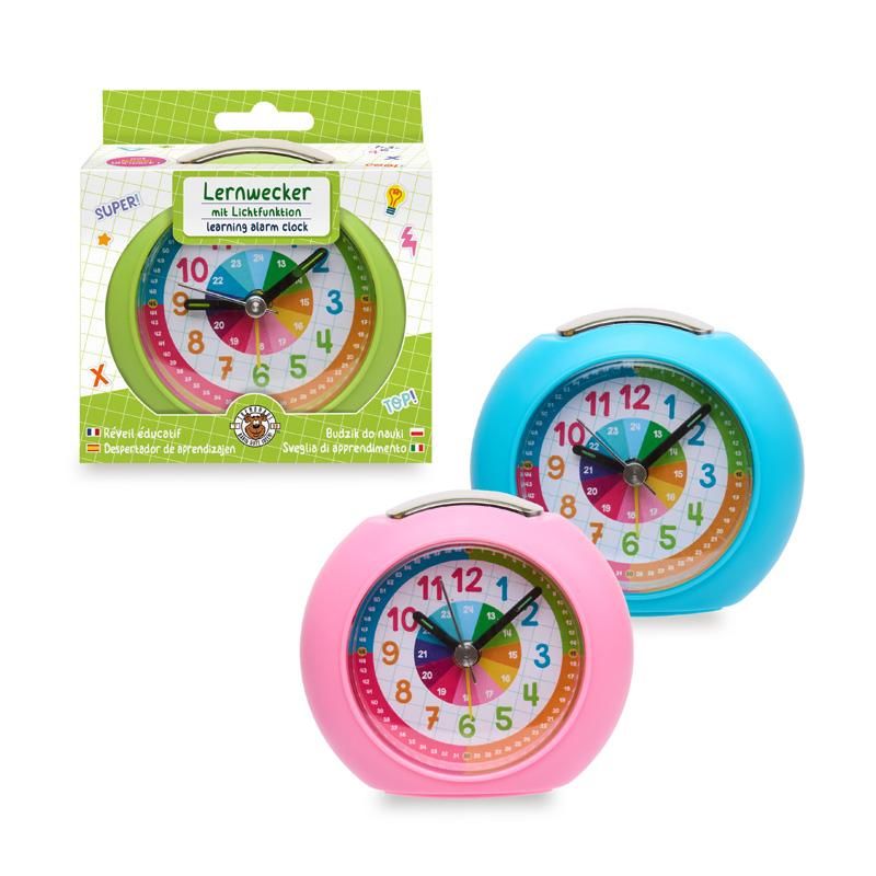 Mit diesem Lernwecker lernen Kinder spielerisch, den Tag in Stunden, Viertelstunden, Minuten und Sekunden einzuteilen. Das speziell gestaltete Ziffernblatt hilft Kindern, die Uhrzeit zu lernen & der Alarm lässt sich leicht einstellen. Inkl. Quarzuhrwerk und integrierter Lichtfunktion. Batterietyp: 1 x 1,5 V AA (nicht im Lieferumfang enthalten). Erhältlich in 3 Farben: blau, grün, pink