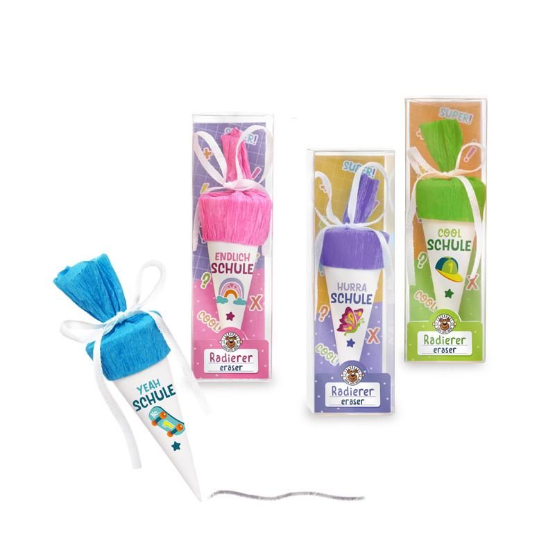 Endlich Schulkind! Dieser ganz besondere Radierer in Form einer kleinen Schultüte inkl. Krepppapier & Satinband ist das perfekte Geschenk zum Schulstart. Verpackt in einer schönen Geschenkbox ist er ein schönes und praktisches Accessoire für die erste Schulzeit. Größe: ca. Ø 3 cm, Höhe: ca. 7,8 cm