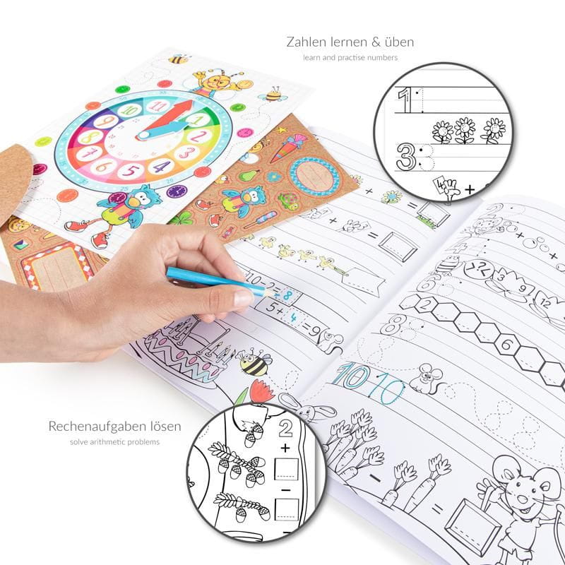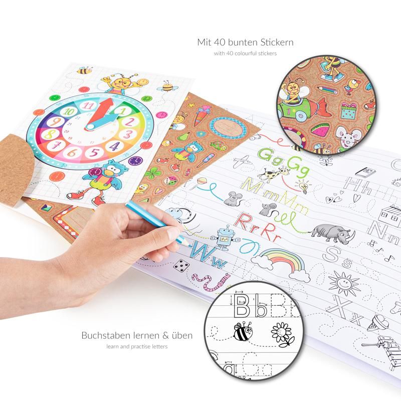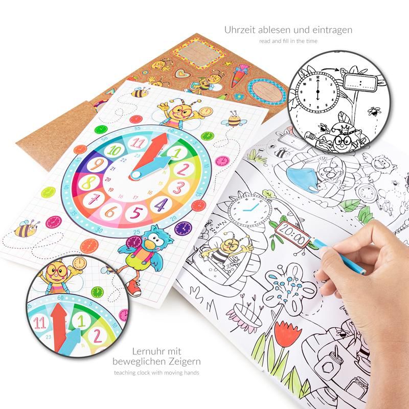 Toller Lern- & Ausmalspaß für Buchstaben, Zahlen und Uhrzeiten auf 3 großen Seiten zum Ausklappen - so macht Lernen richtig Spaß! Auch kleine Rechenaufgaben sind durch die liebevollen Illustrationen leicht zu lösen. Die Lernuhr mit beweglichen Zeigern hilft zusätzlich, die Uhrzeit zu lernen und zu üben. Außerdem können Kinder die beiliegenden 40 Sticker nutzen, um die Seiten individuell zu verzieren und zu gestalten.