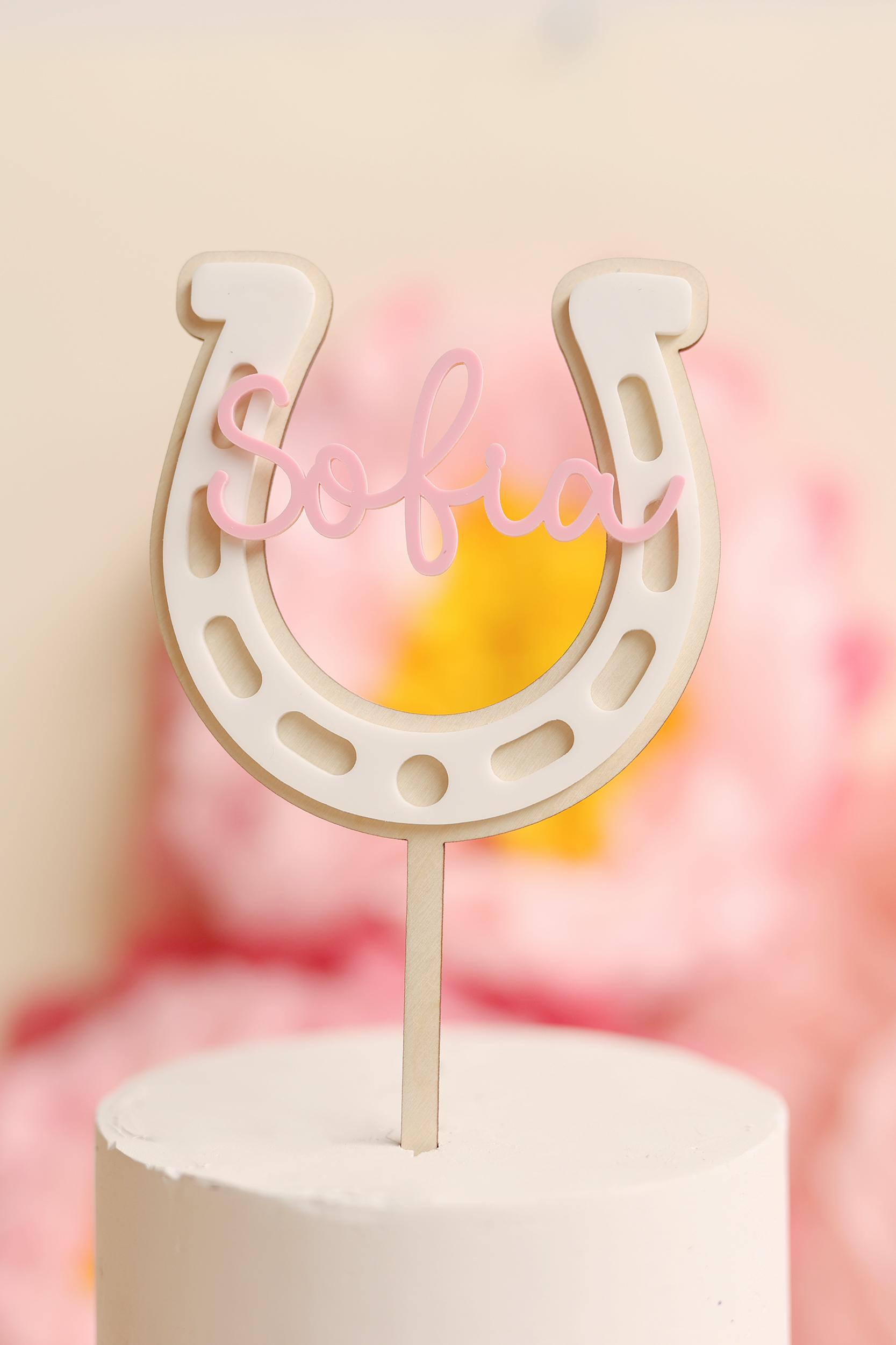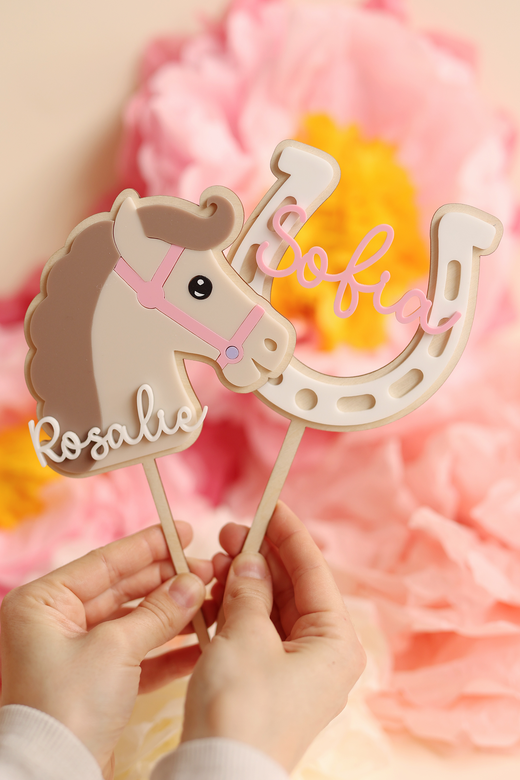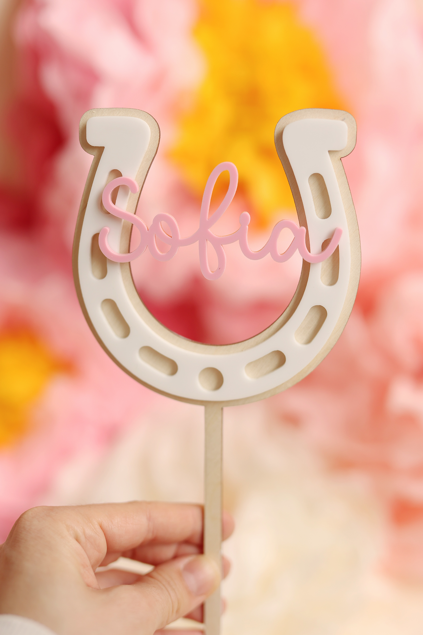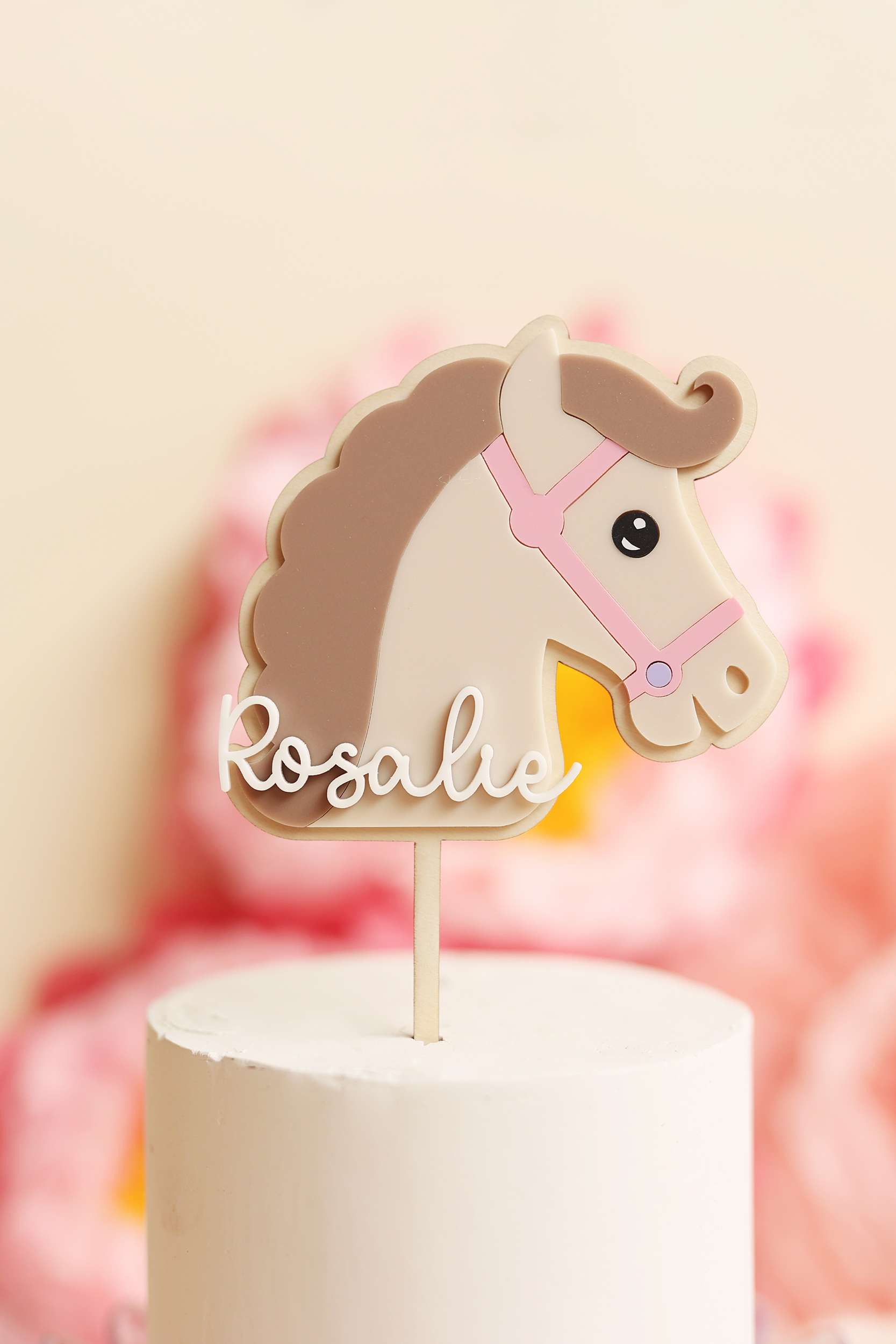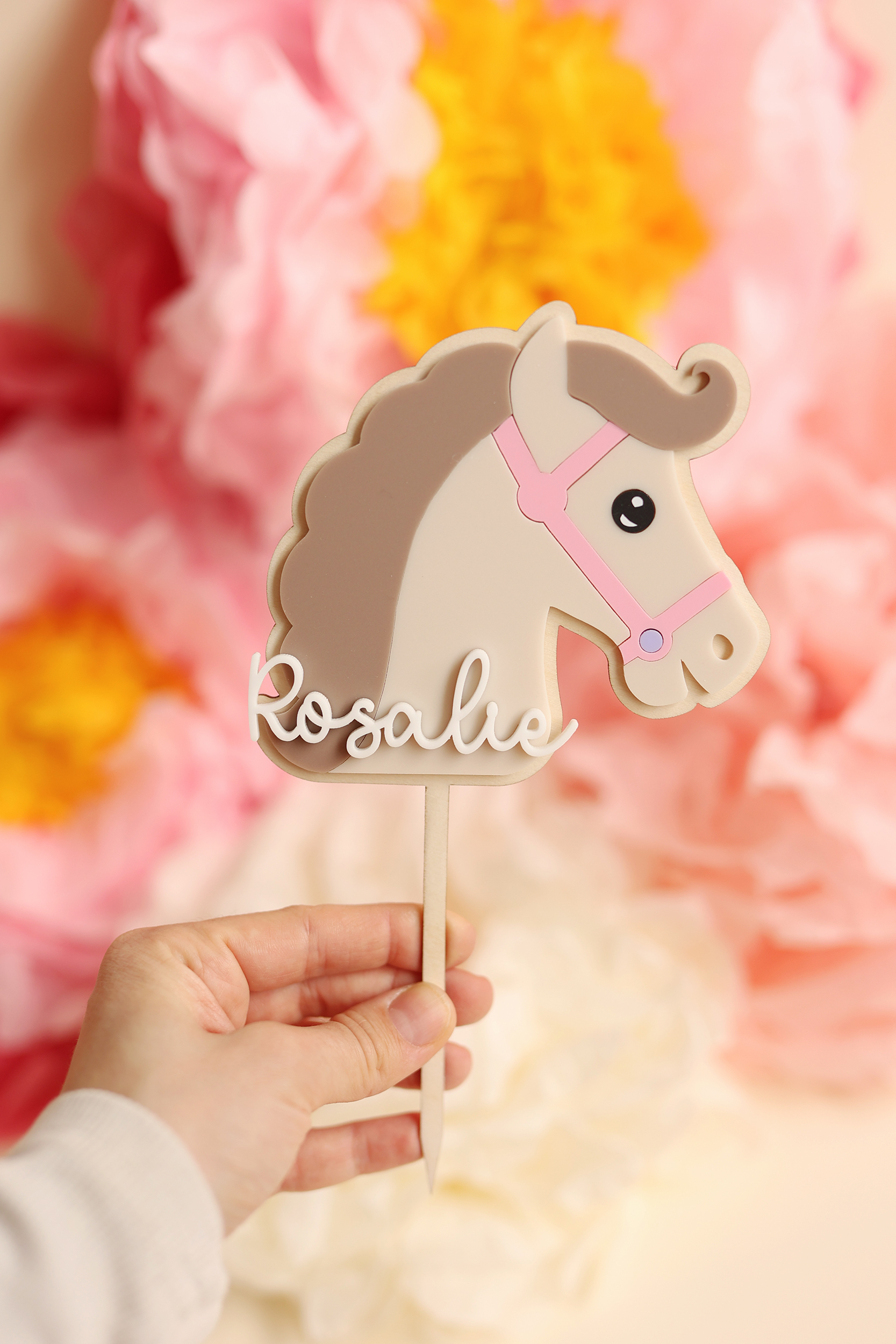 Dieser liebevoll gestaltete Cake Topper aus hochwertiger Birkenholz und farbigem PMMA ist ein ganz besonderer Blickfang für Geburtstage, Einschulungen oder Pferde-Mottopartys.
