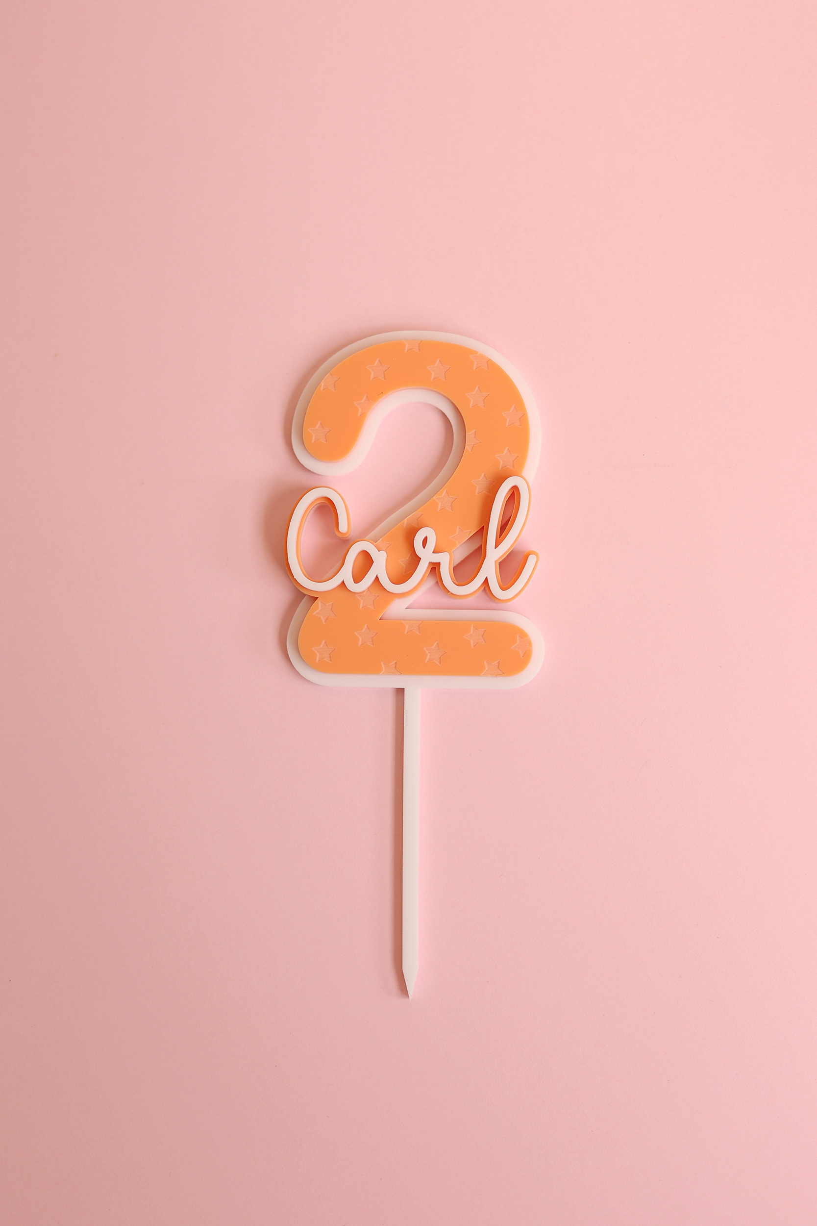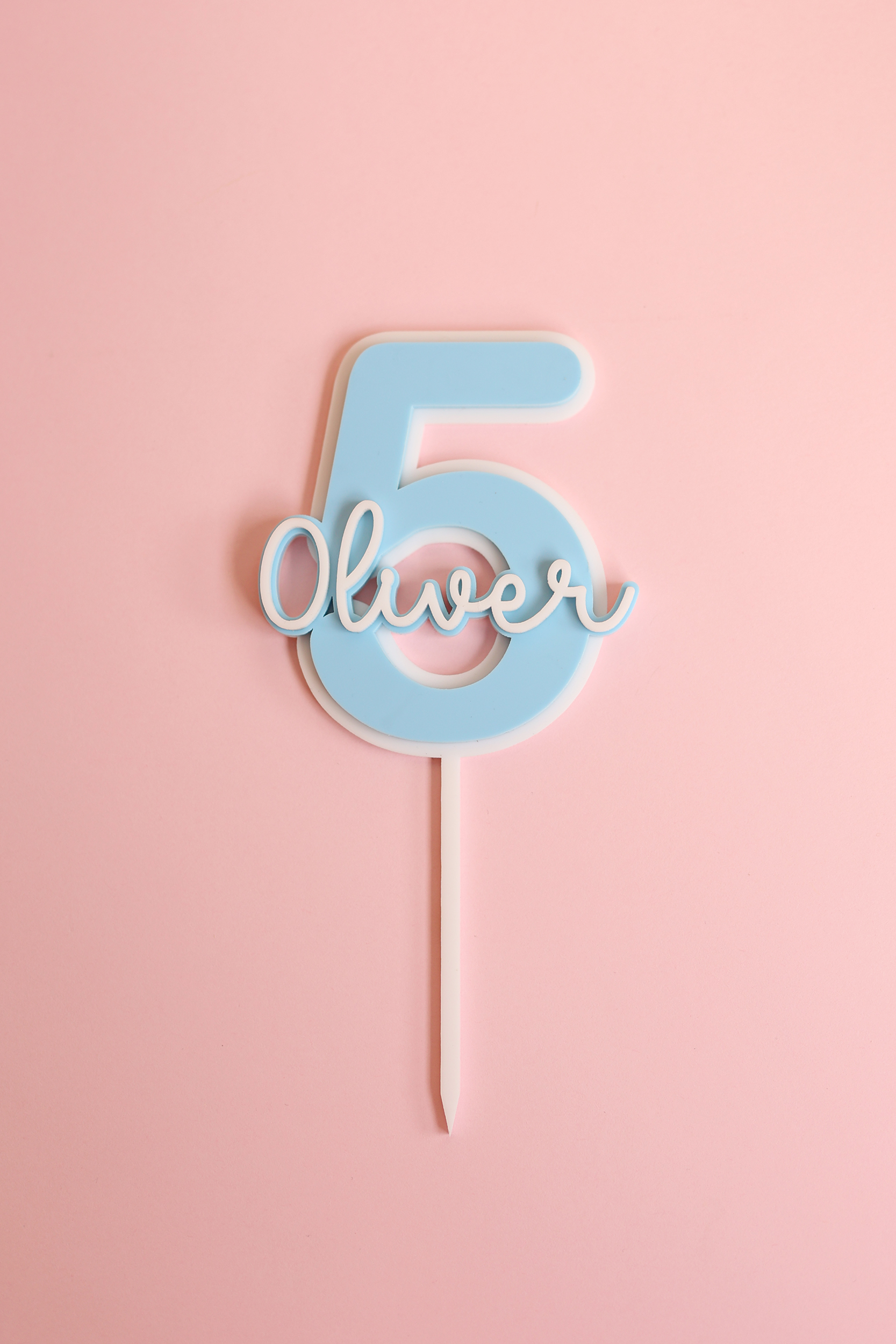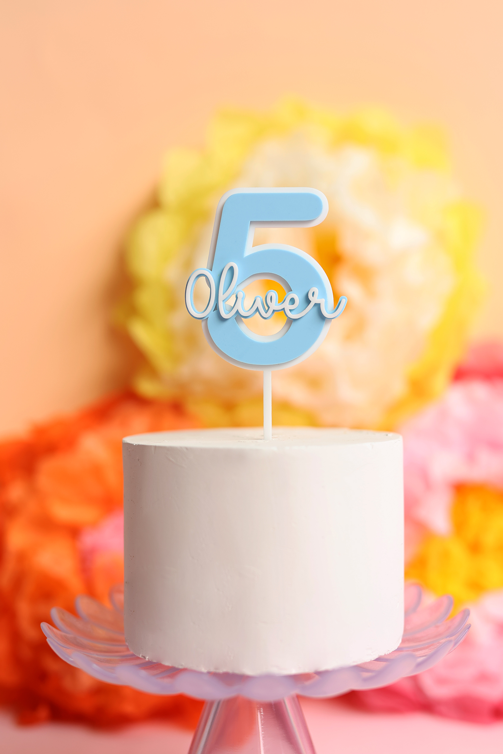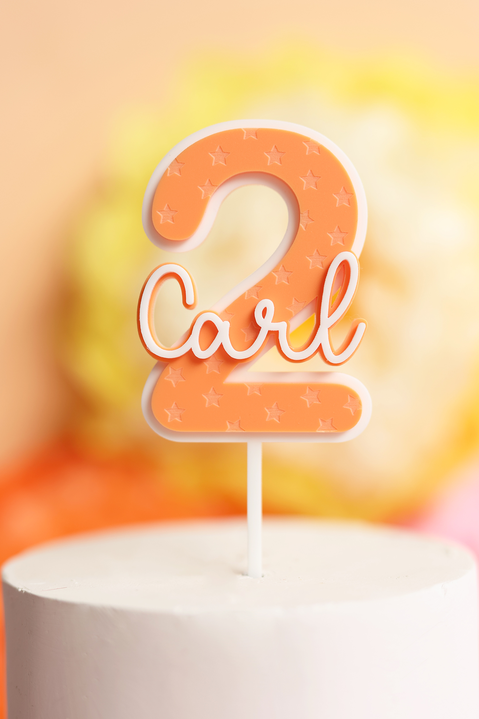 Der Topper besteht aus einer weißen Basis, einer farbigen Zahl (mit oder ohne Muster) sowie einem weißen Namen.