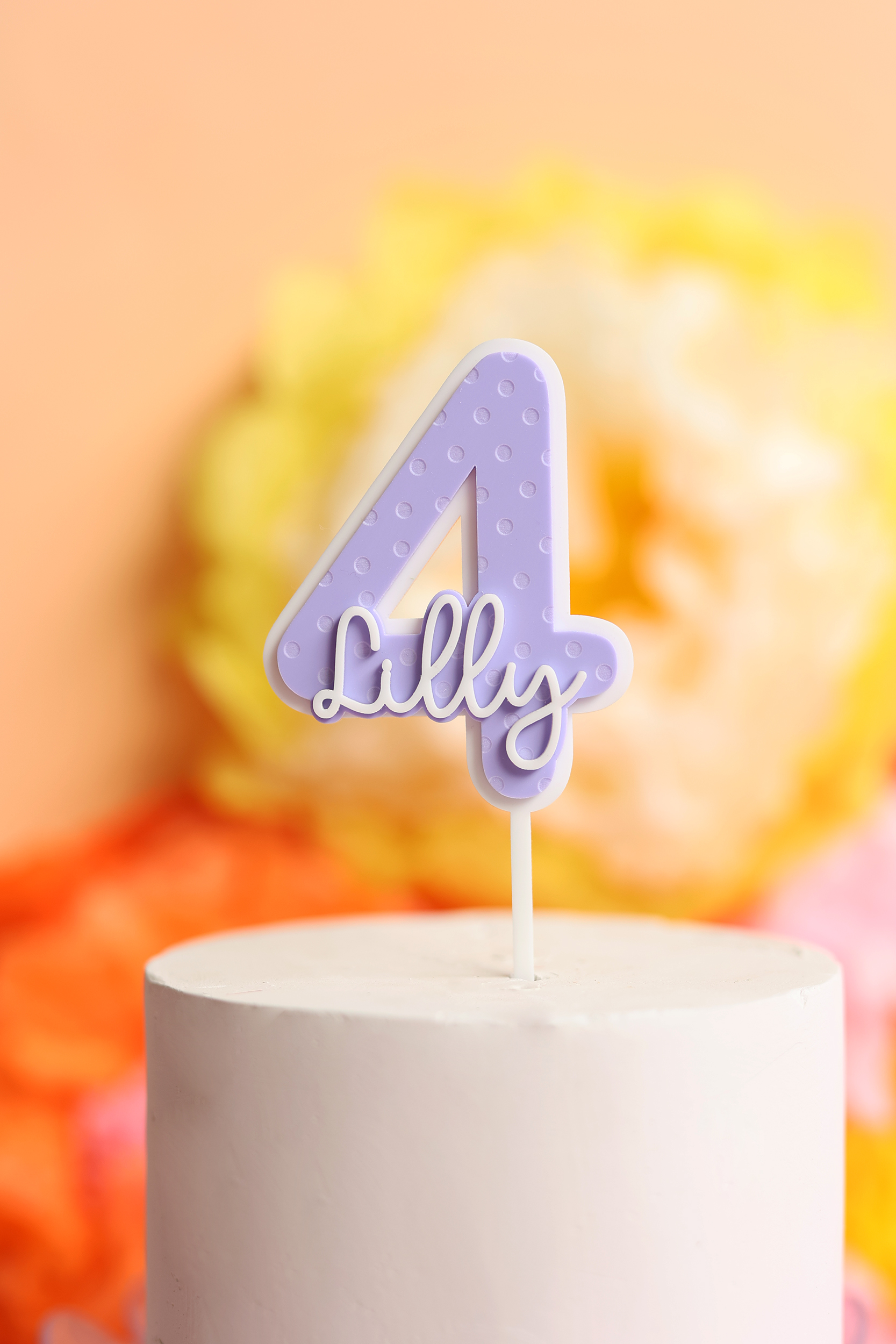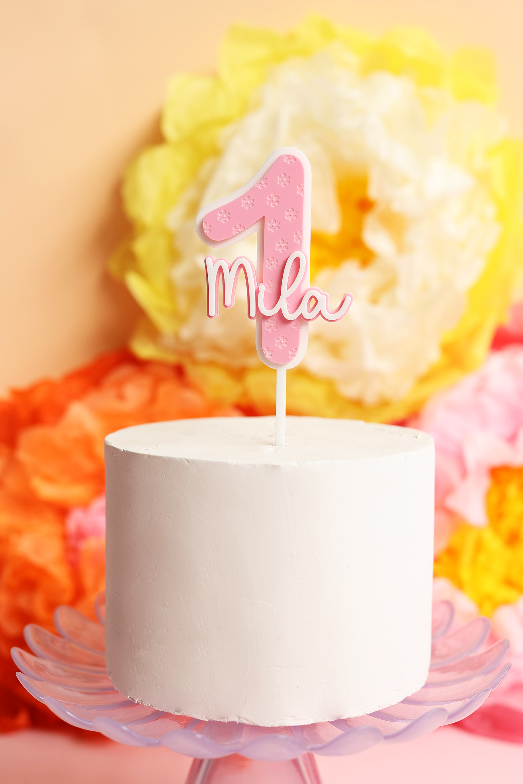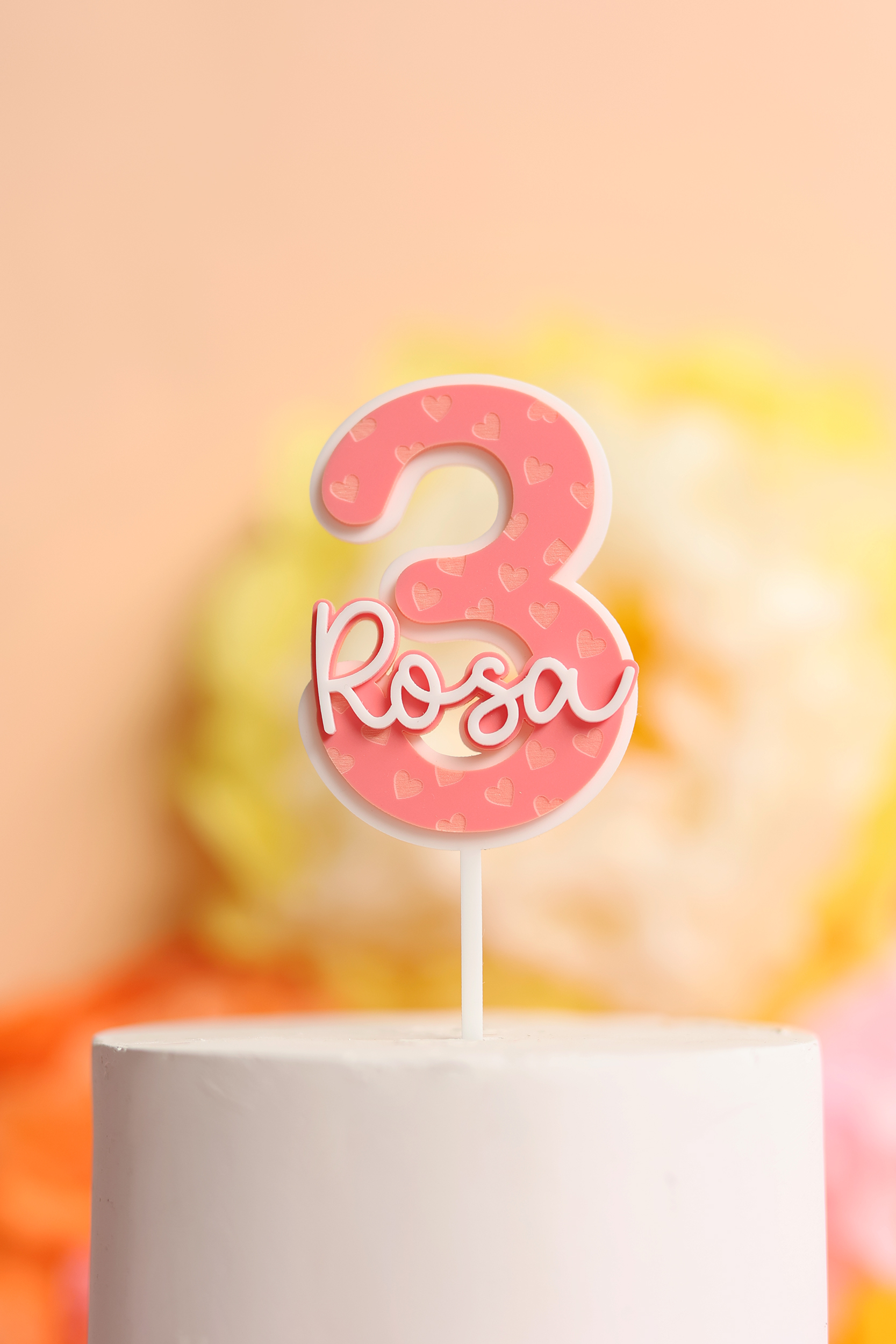 Der Topper besteht aus einer weißen Basis, einer farbigen Zahl (mit oder ohne Muster) sowie einem weißen Namen.