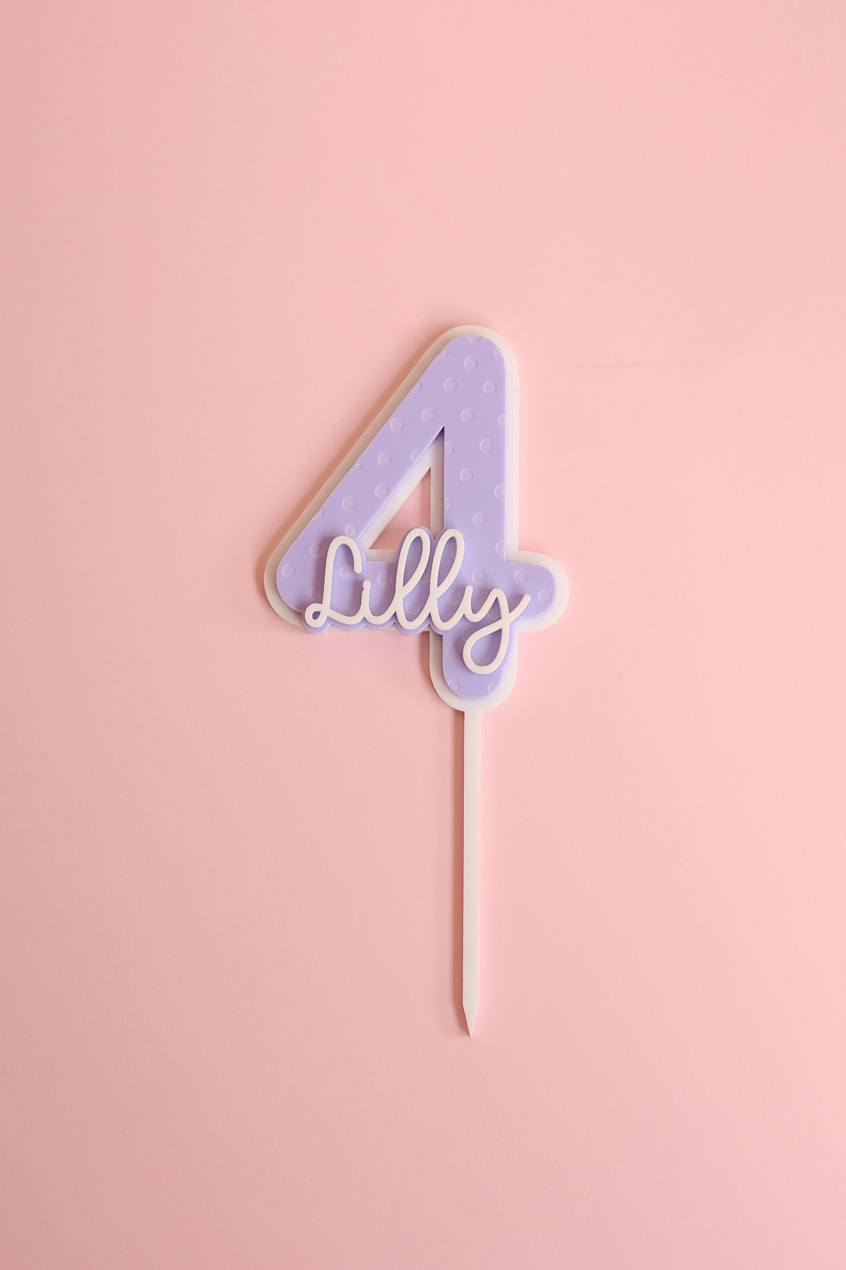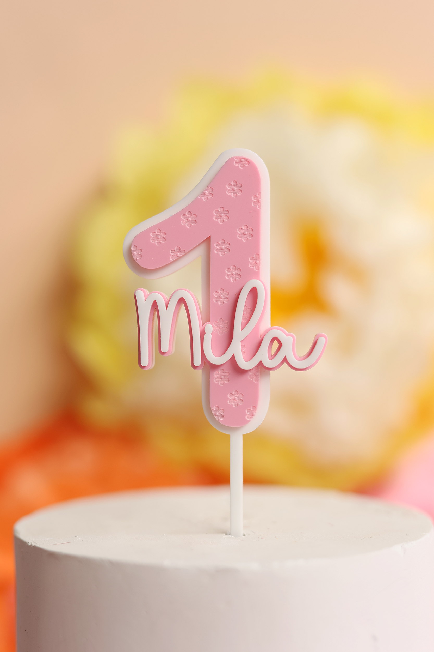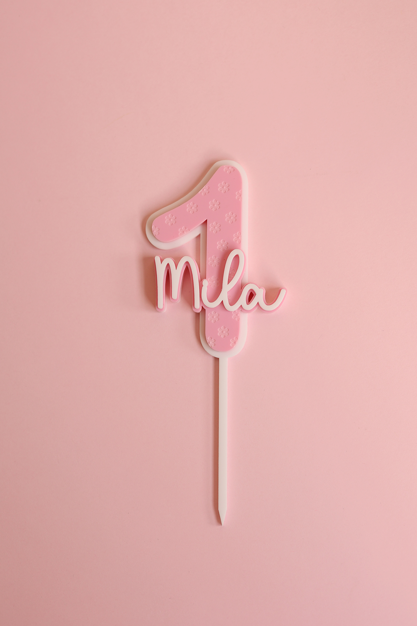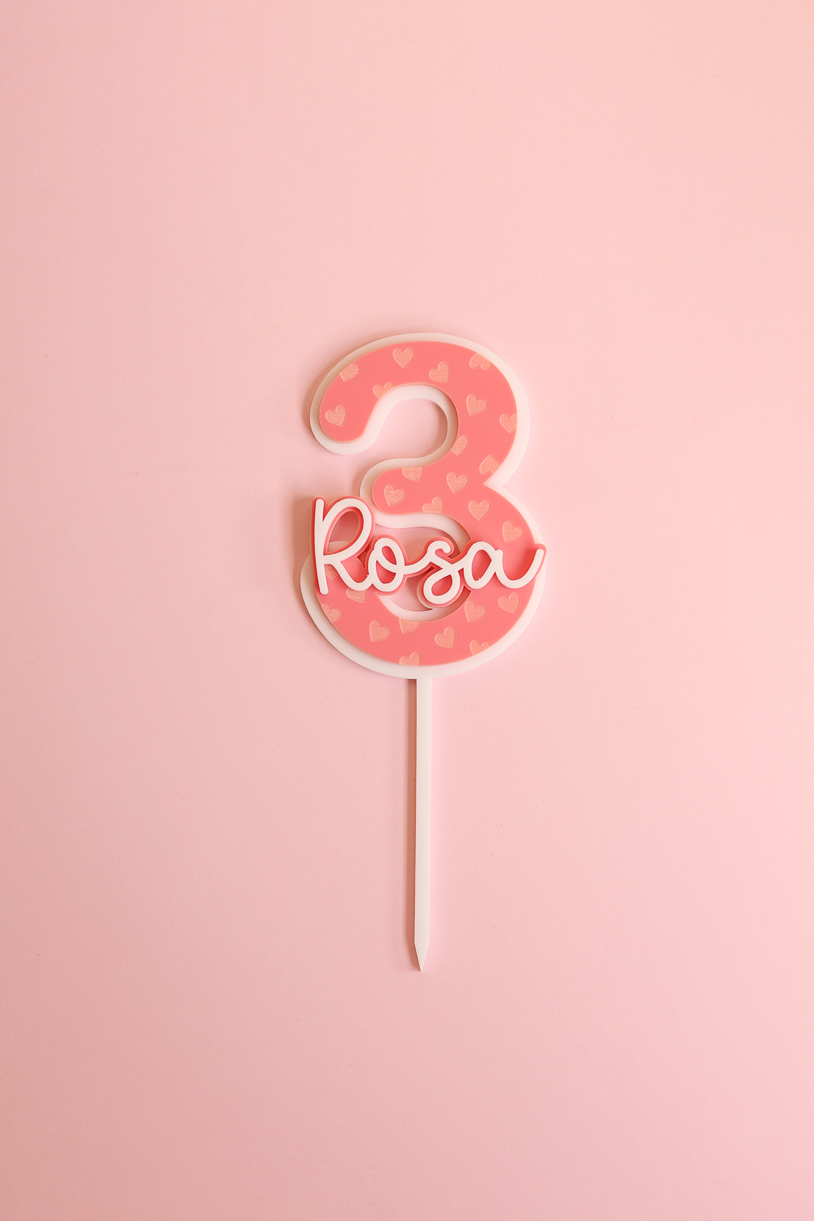 Der Topper besteht aus einer weißen Basis, einer farbigen Zahl (mit oder ohne Muster) sowie einem weißen Namen.