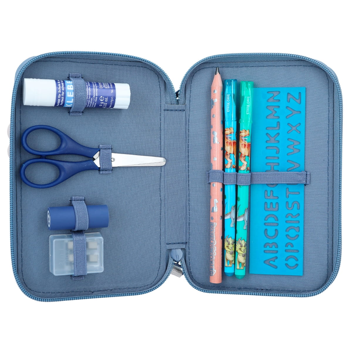 Die blaue Federtasche aus der Serie Dino World Mini hat einen niedlichen aufgesetzten grünen Frottee-Dino auf der Front, vor dessen Maul ein lustiger Knochen-Anhänger baumelt. Die zwei separaten Fächer sind komplett gefüllt mit 12 dicken Buntstiften, 2 Glitzer-Gelstiften, einem dicken Bleistift, Doppel-Anspitzer, Radierer, Lineal (mit Schablonen), Schere und Klebestift. Material: 100 Prozent Polyester mit PVC-Beschichtung (abwischbar)