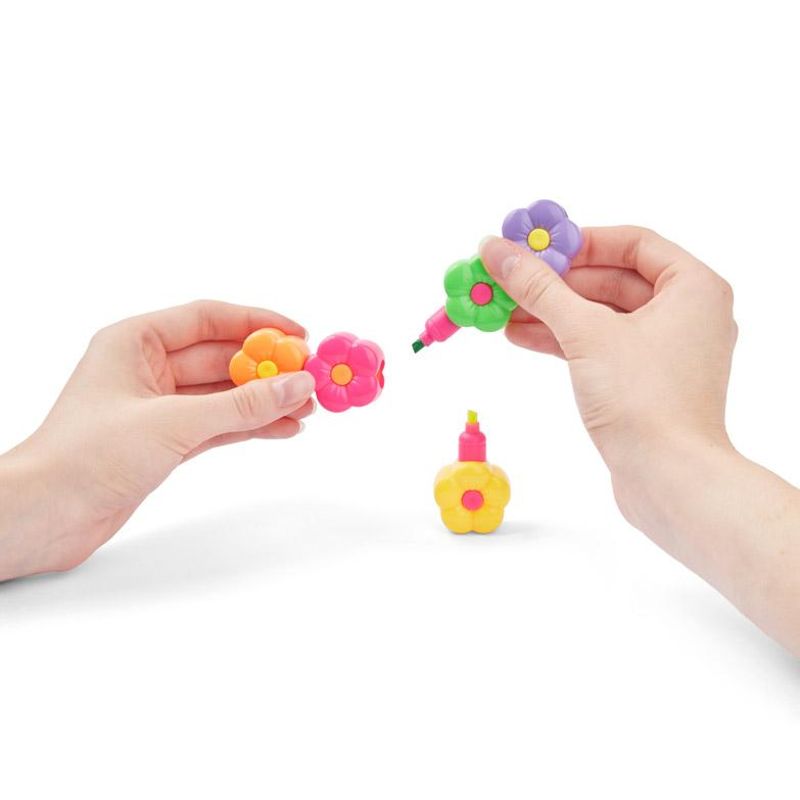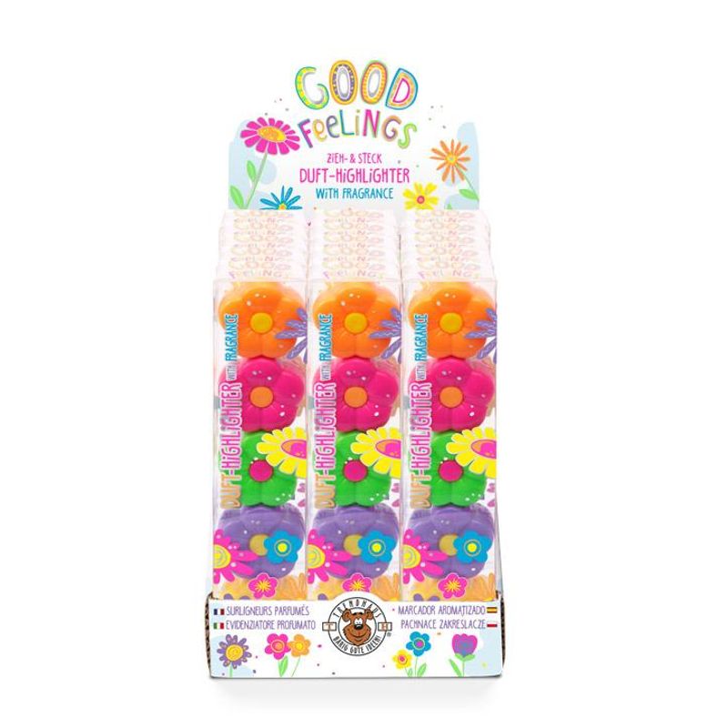 Farbige Akzente mit Flower-Power! Diese 4 steckbaren Duft-Highlighter in den Schreibfarben gelb, lila, grün und pink sind perfekt zum Markieren, Unterstreichen und Malen. Außerdem inkl. Geschenkverpackung in Neonfarben und mit effektvoller Silberfolierung! Mit praktischer Keilspitze, Strichstärke ca. 4 mm.