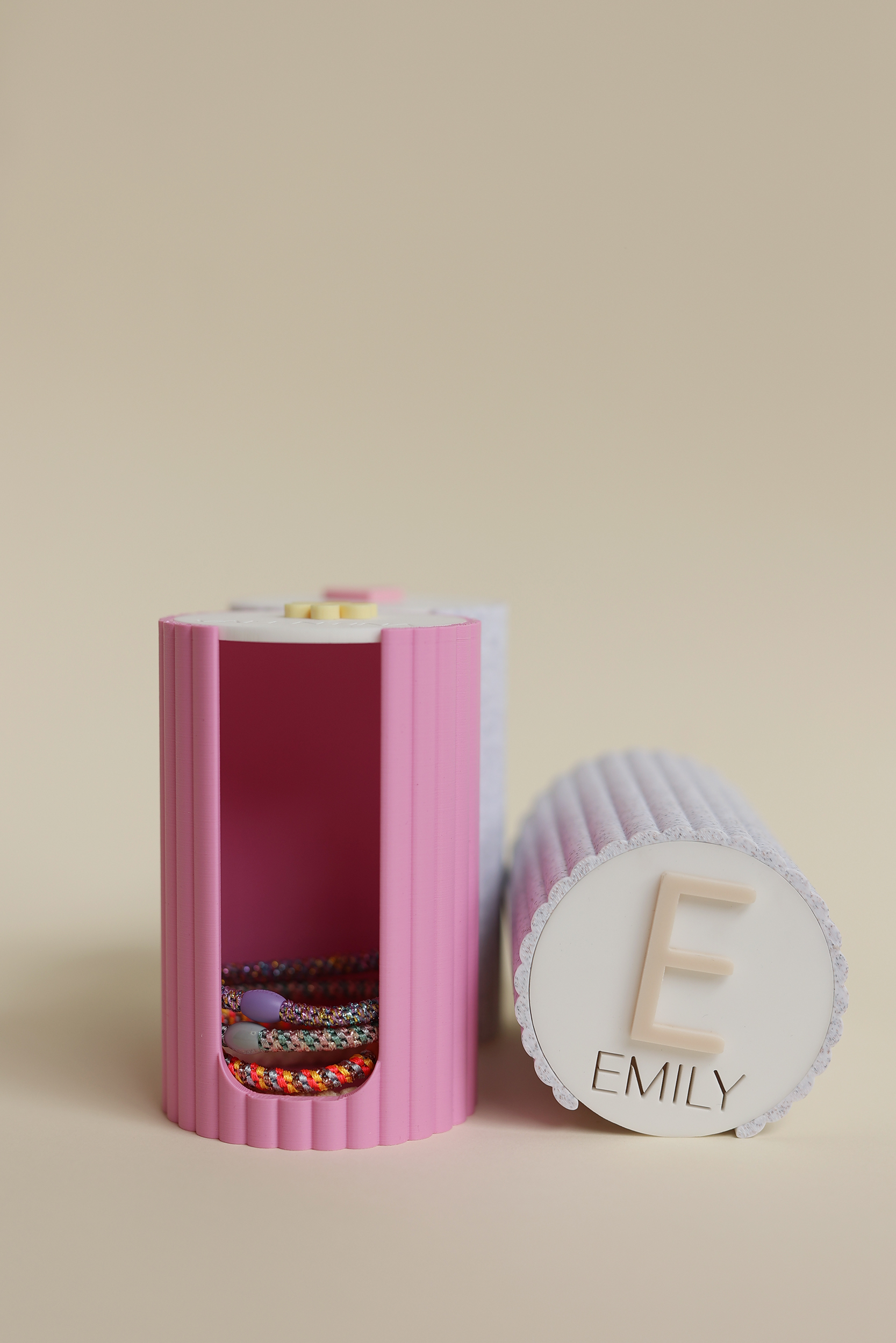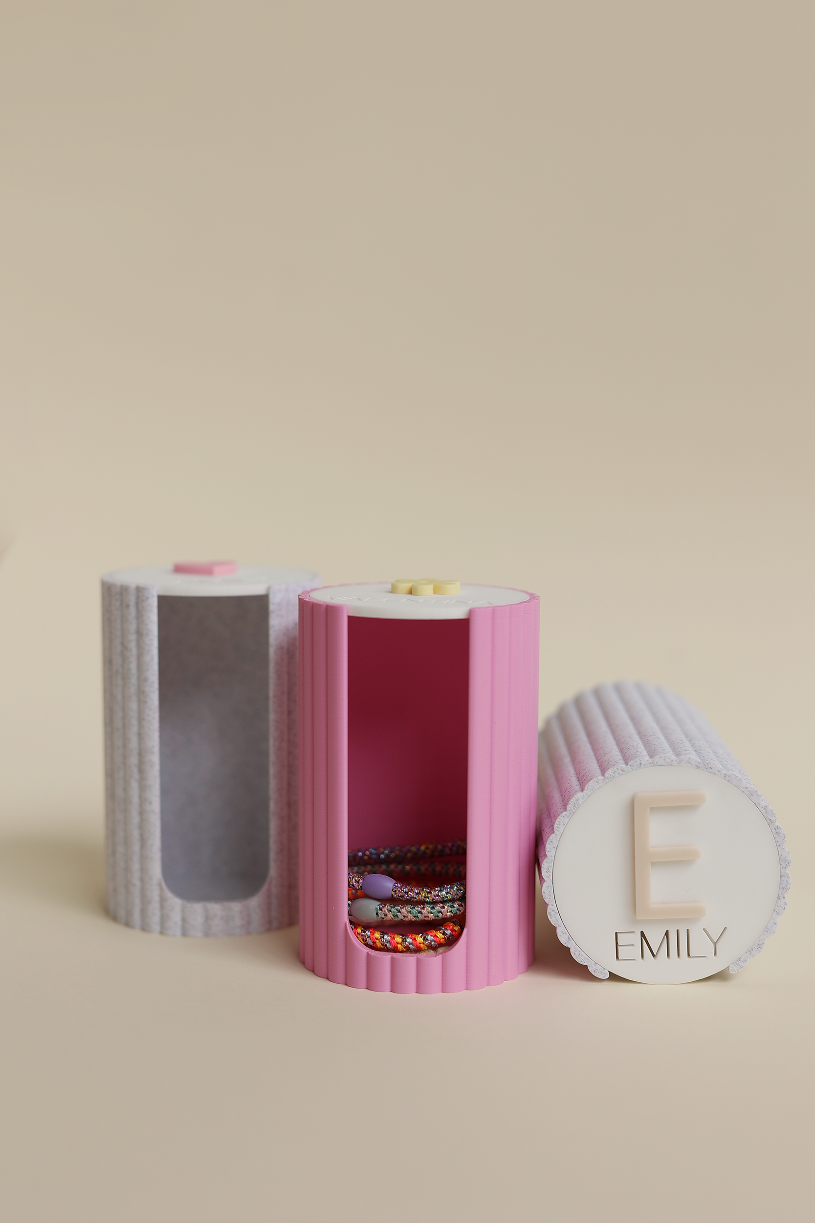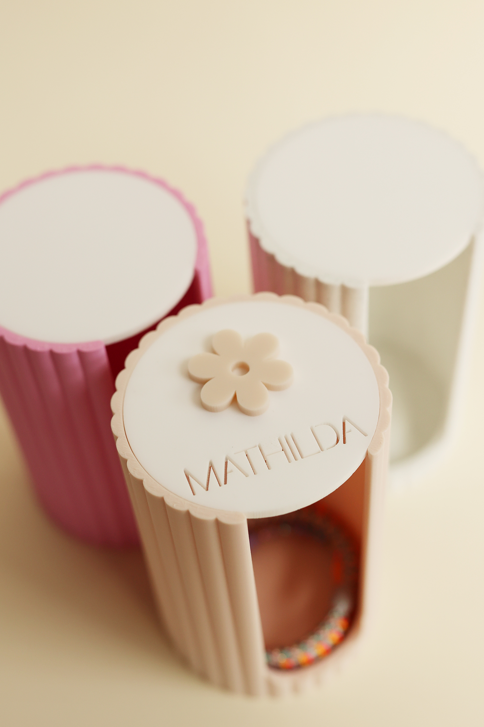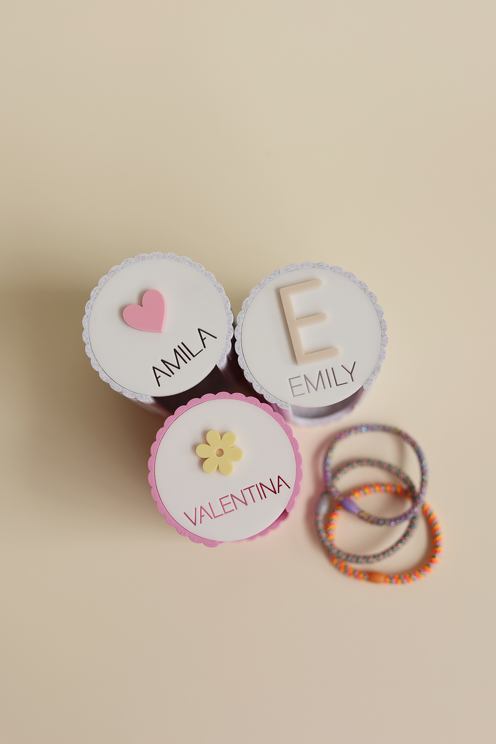 Personalisierte Deckel: Wähle zwischen einer beigen Buchstaben-Aufschrift, einem rosa Herz oder einem gelben Blümchen – perfekt als Geschenkidee.