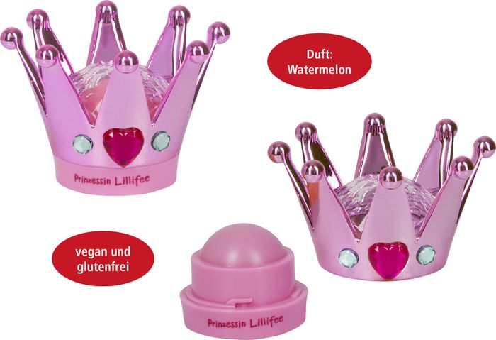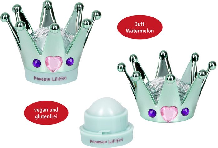 Willkommen in der zauberhaften Welt von Prinzessin Lillifee und ihren Freunden: Der duftende Lipbalm von Die Spiegelburg darf auf dem Schminktisch kleiner Prinzessinnen nicht fehlen. Dieser vegane und glutenfreie Lippenbalsam in Form einer funkelnden Krone, sorgt nicht nur für weiche Lippen, sondern begeistert auch mit einem fruchtig-süßen Duft nach Wassermelone. Mit einer praktischen Größe von ca. 7 x 5 cm passt er perfekt in jede Kosmetiktasche und ist der ideale Begleiter für kleine Prinzessinnen. Erhältlich in 3 Designs.