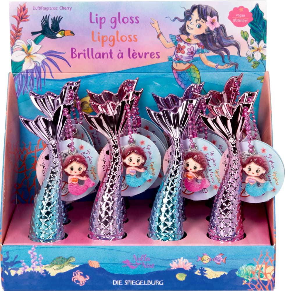 Für ein strahlendes Lächeln und magisches Meerjungfrauen-Flair sorgt der Lipgloss von Nella Nixe. Mit seiner schimmernden Flossen-Optik und dem charmanten Meerjungfrauen-Anhänger wird dieser Lipgloss zum Must-Have für kleine und große Meerjungfrauen-Fans. Der Lipgloss ist vegan und glutenfrei, duftet fruchtig nach Kirsche und verleiht den Lippen einen eleganten Schimmer. Ein zauberhaftes Beauty-Accessoires für trendbewusste Mädchen. Erhältlich in 2 Designs.