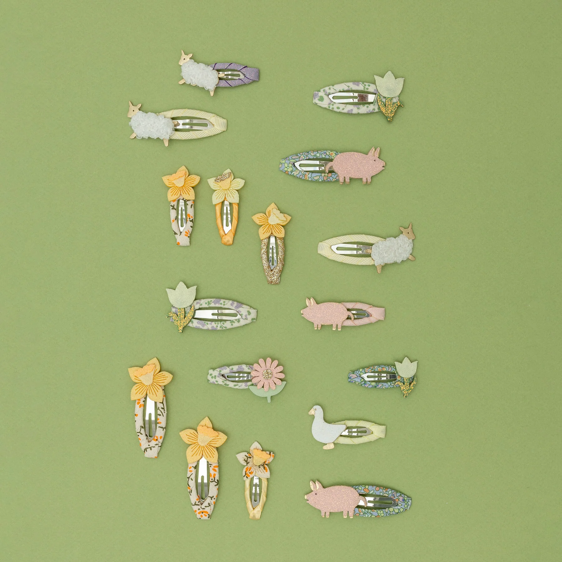 Diese Farmyard Mini-Clips sind voller ländlichen Charme! Mit dem süßesten kleinen Vieh und auch frischen Blüten - das ideale Zubehör für den Ausstieg 'n' über diesen Frühling!