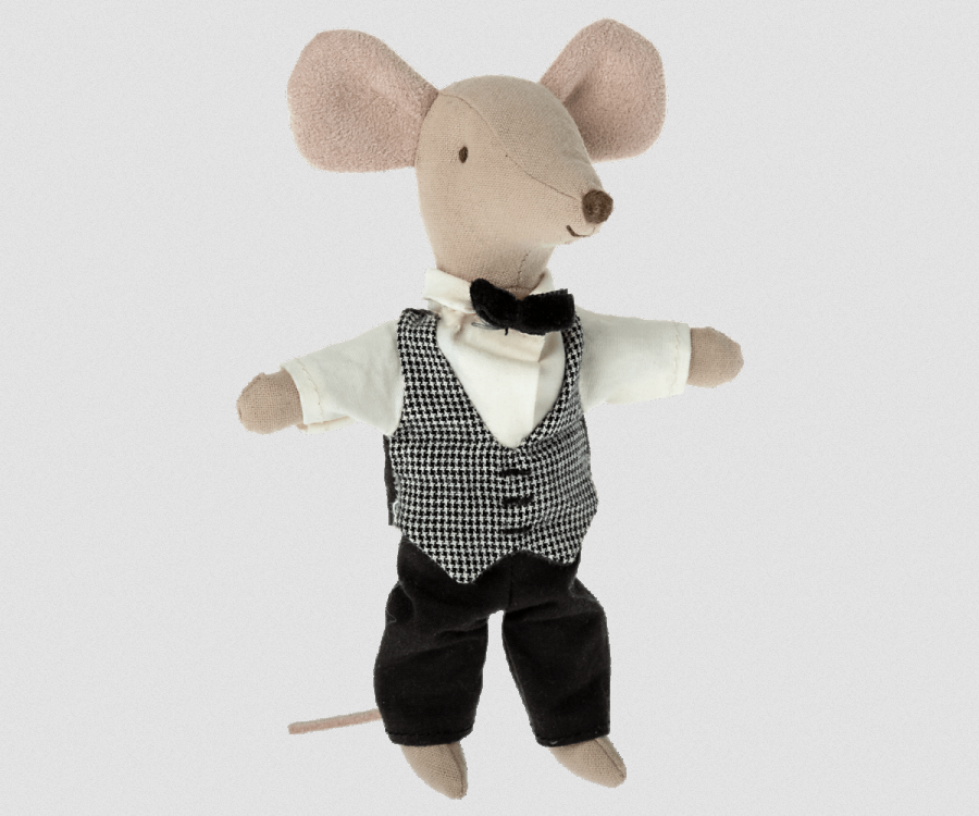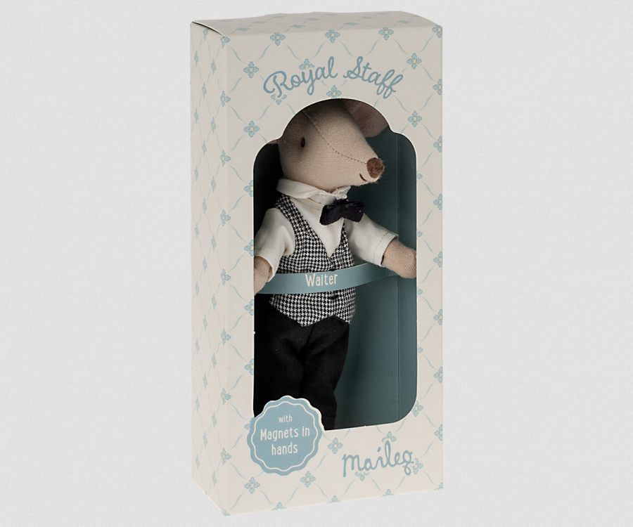 Die Kellnermaus ist der perfekte Helfer auf jeder Party oder bei jeder königlichen Familie. Die Maus ist klassisch gekleidet und hat Magnete in den Händen, so dass es einfacher ist, alle Metallutensilien zu halten.