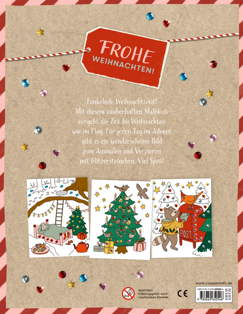 Dieser zauberhafte Malblock enthält 24 weihnachtliche Motive, die darauf warten, von kleinen Künstlerinnen und Künstlern ausgemalt und mit Glitzersteinchen verziert zu werden.