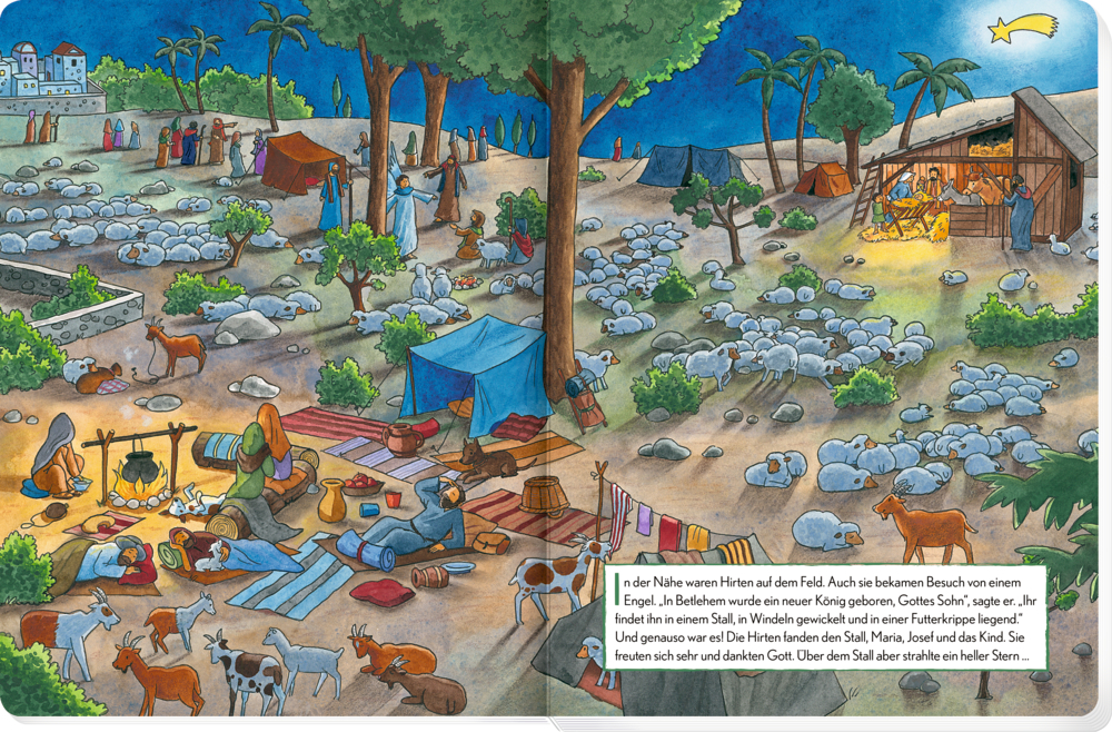 In 6 liebevoll gestalteten Wimmelbildern und mit einfachen Worten erzählt dieses Buch die biblische Weihnachtsgeschichte nach Matthäus und Lukas – von der Ankündigung über die Herbergssuche in Betlehem bis hin zur Flucht nach Ägypten. Ein wimmeliger Suchspaß mit vielen spannenden Details, der schon den Kleinsten erklärt, was wir an Weihnachten feiern: die Geburt des Jesuskindes.
