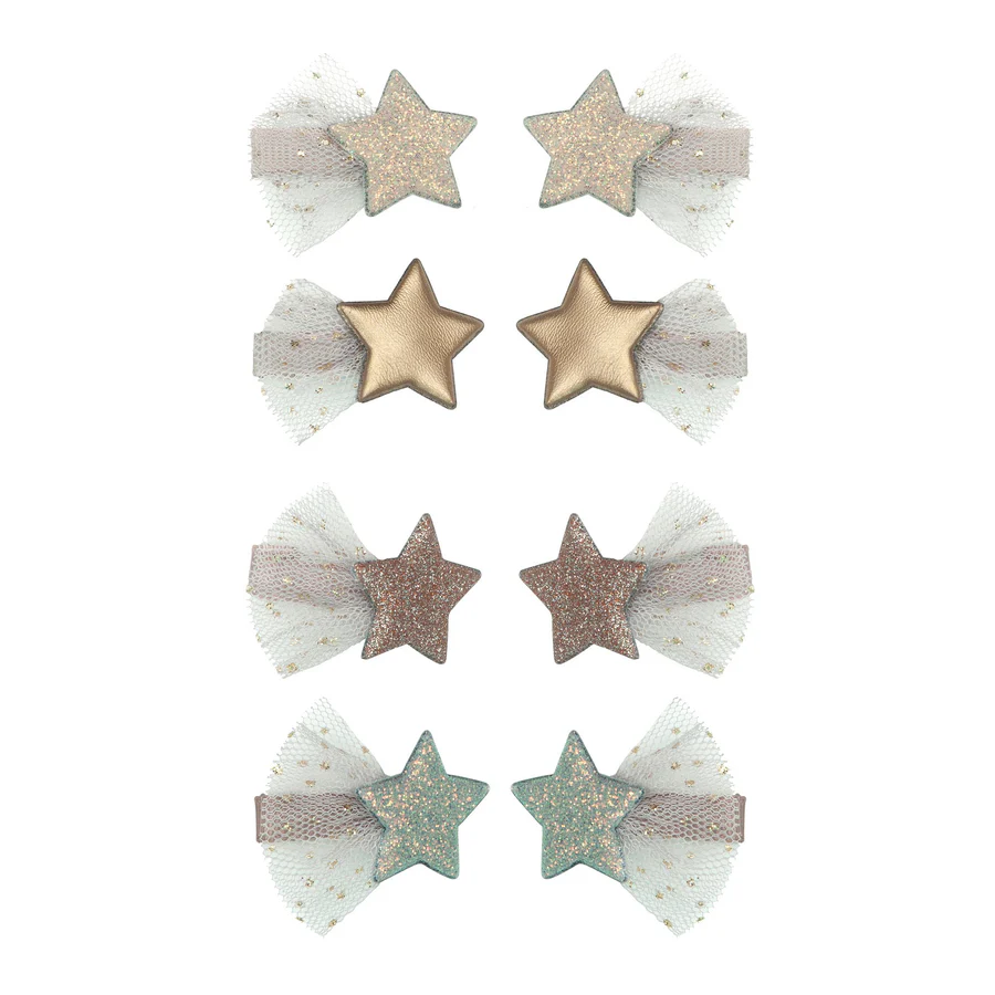 3 cm lange, mit Ripsband umwickelte Mini-Krokodilklemmen mit goldmetallischen und fein glitzernden Sternen aus gepolstertem Stoff über goldglitzerndem Tüll.