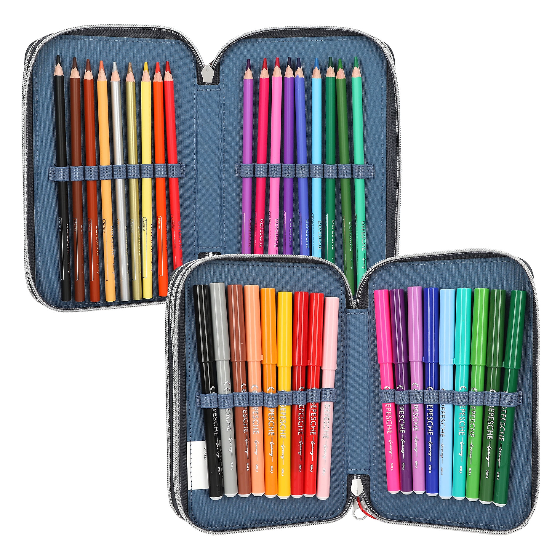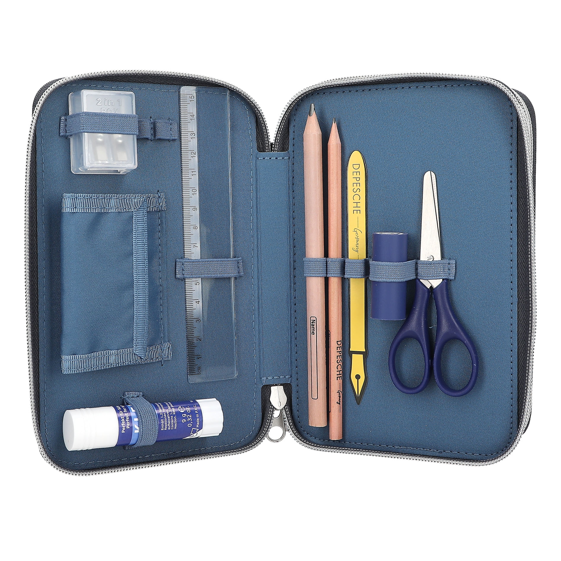 - komplett gefüllte Federtasche mit 3 Reißverschluss-Fächern