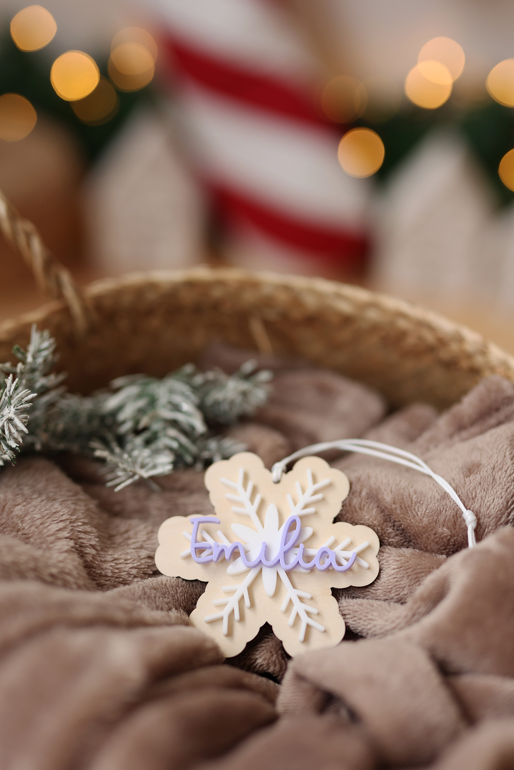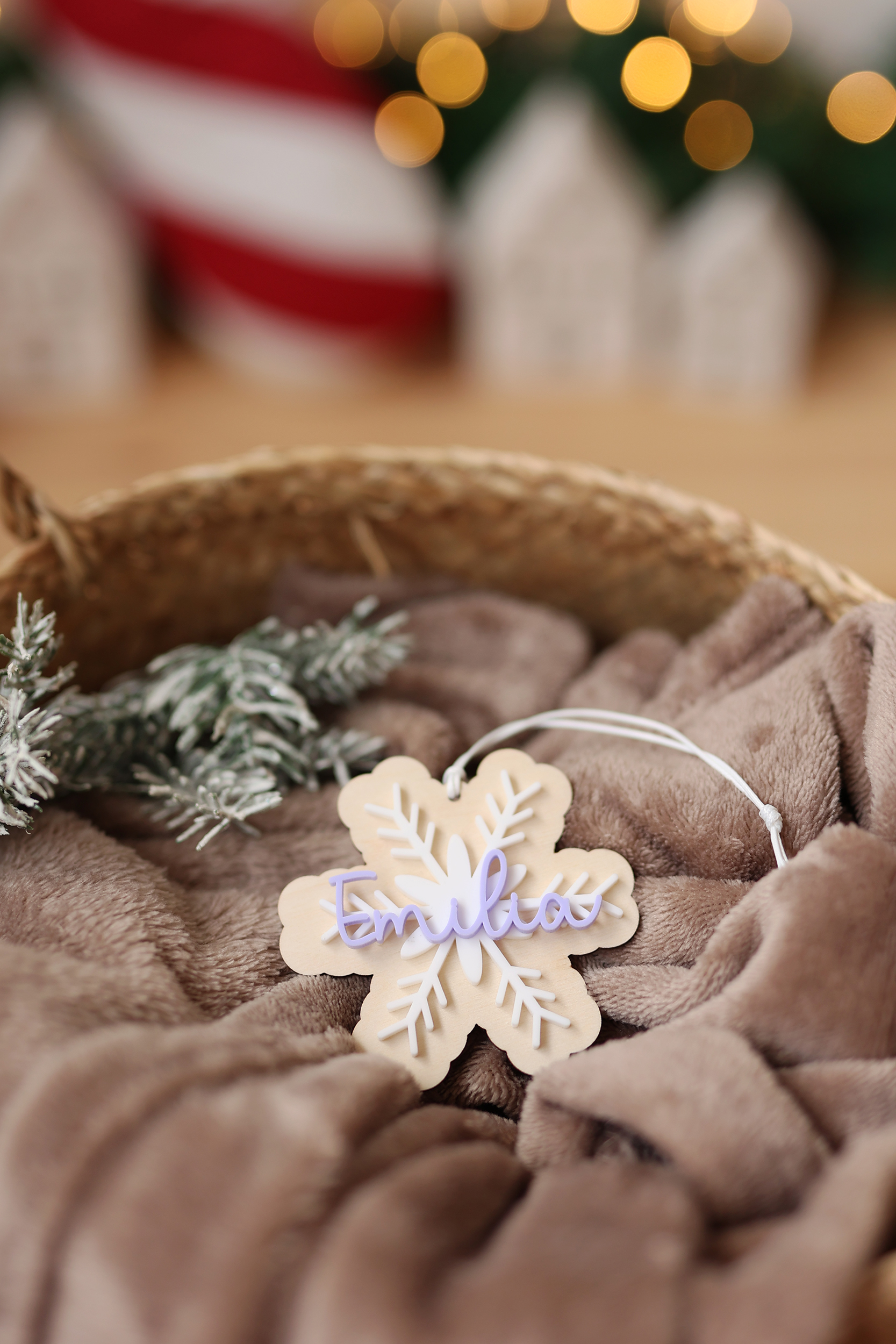 Unser personalisierter Schneeflocken-Anhänger aus Holz und Acryl ist die perfekte Kombination aus schlichter Eleganz und liebevollen Details.