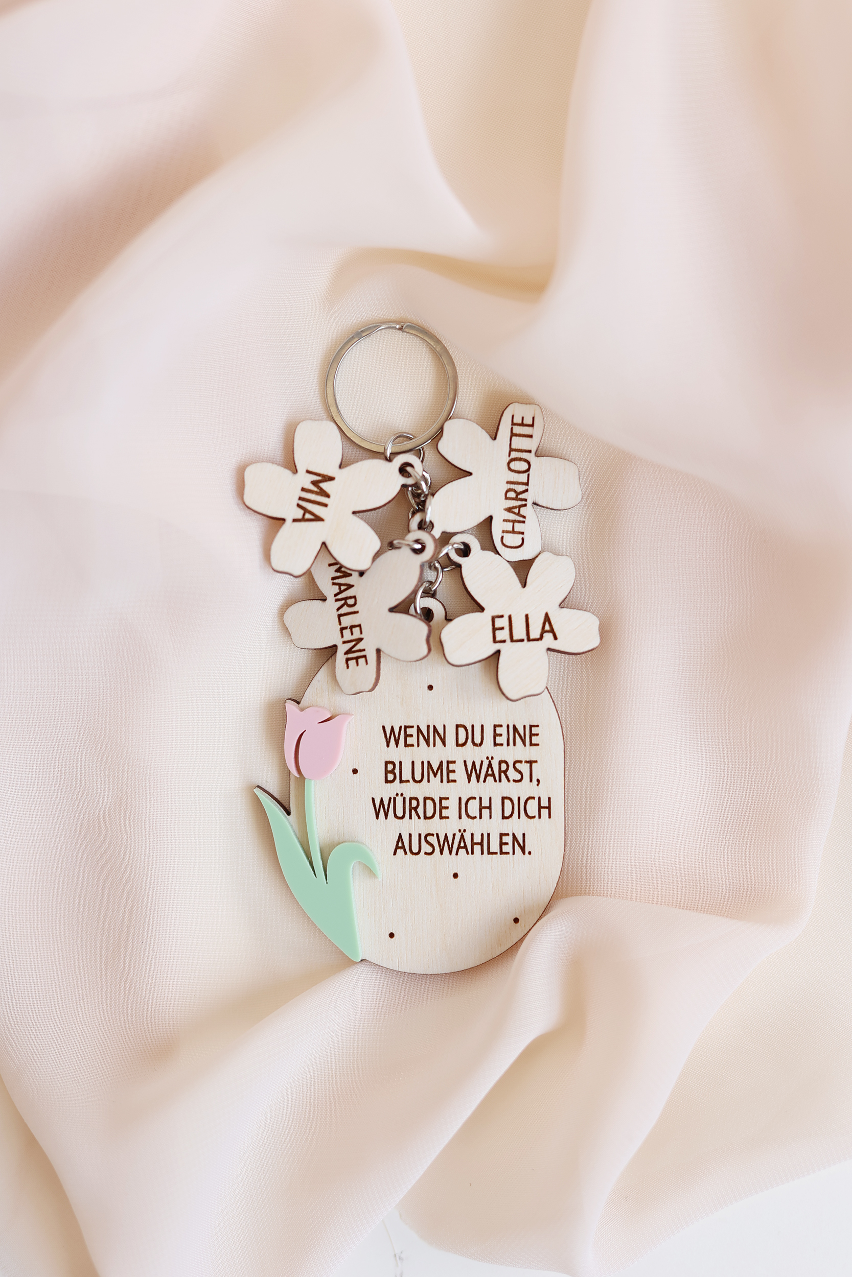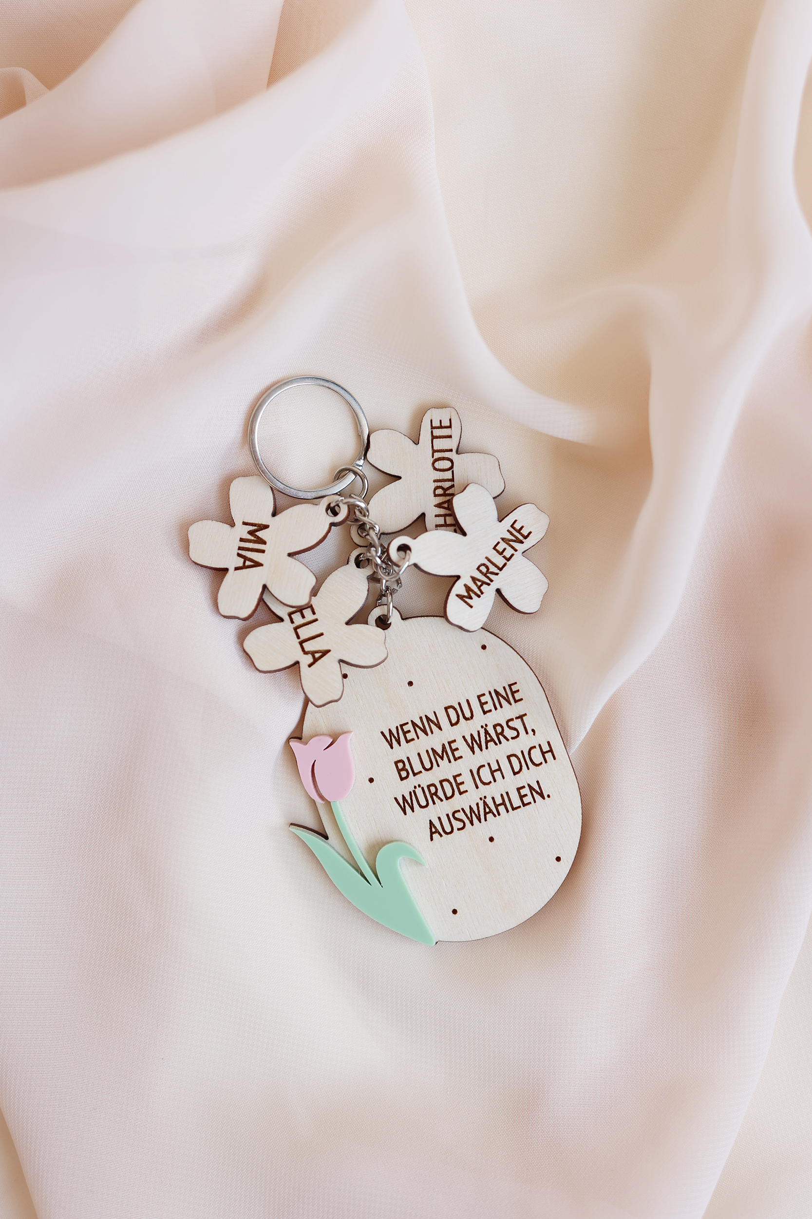 Ein liebevoll gestalteter Schlüsselanhänger aus natürlichem Birkenholz mit zarten Details aus PMMA – das perfekte Geschenk zum Muttertag oder für eine ganz besondere Herzensperson.