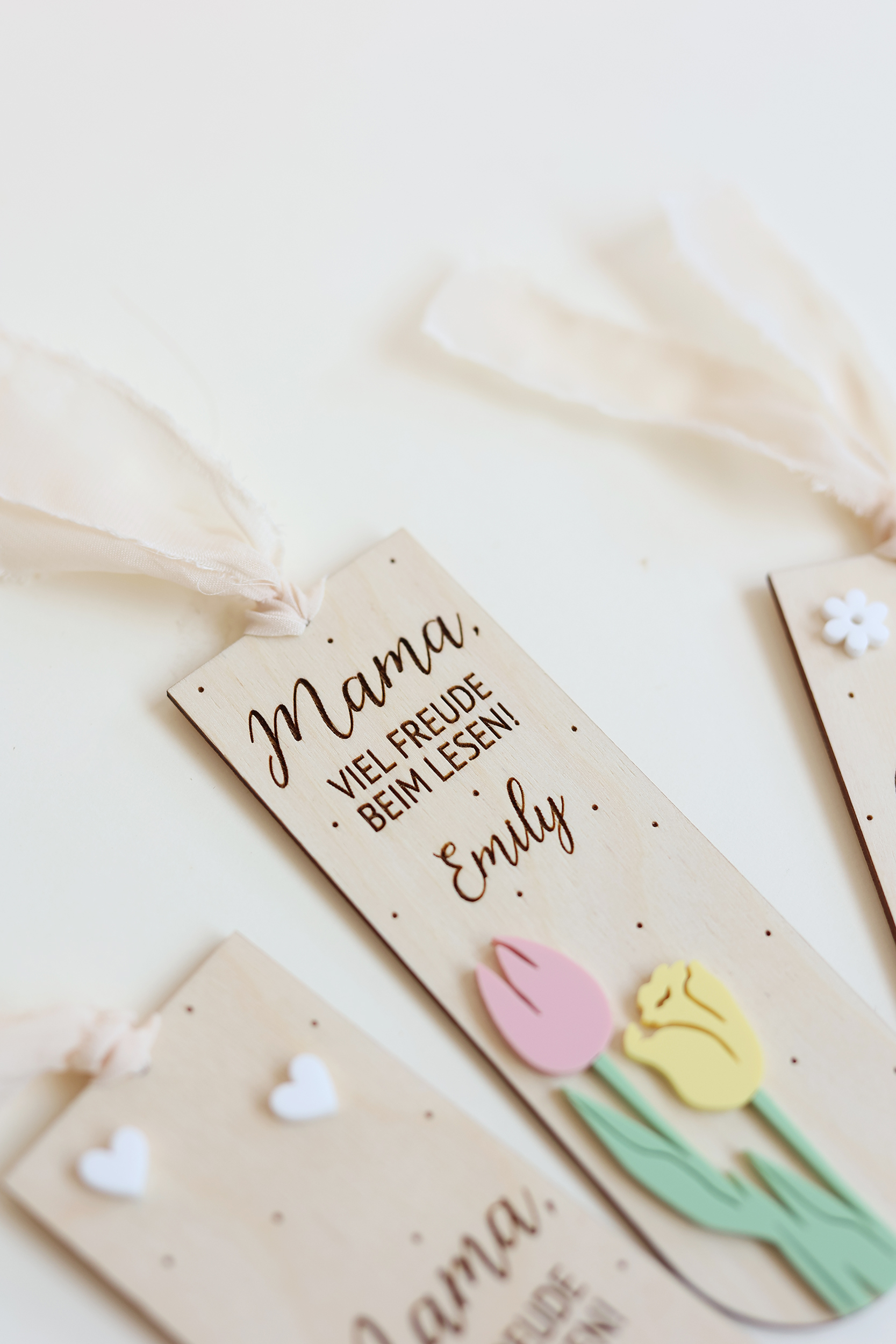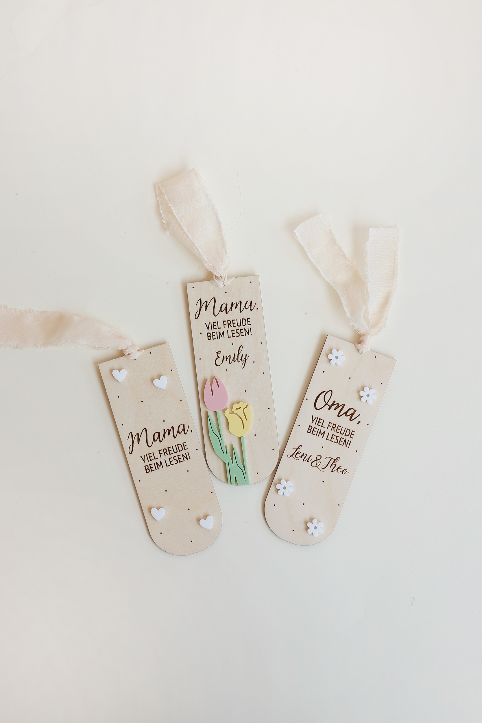 Gefertigt aus hochwertigem Birkenholz und verziert mit zarten Details aus PMMA, überzeugt das Lesezeichen durch sein schlichtes, modernes Design. Die verschiedenen Motive wie Blumen, Herzen oder Tulpen machen jedes Stück einzigartig.