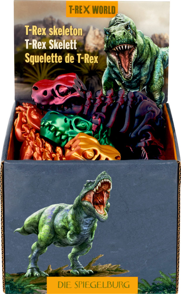 Tauche ein in die faszinierende Welt der Dinosaurier mit dem beeindruckenden T-Rex Skelett von Die Spiegelburg! Die metallisch schimmernde Oberfläche zieht alle Blicke auf sich und sorgt mit ihren variierenden Glanzeffekten für eine geheimnisvolle Atmosphäre. Mit einer Größe von ca. 24 x 4 x 14 cm und beweglichen Gelenken wird dieser mächtige König der Urzeit zum Leben erweckt und lässt Fantasien von kleinen und großen Dino-Fans Wirklichkeit werden. Erhältlich in 3 Designs.