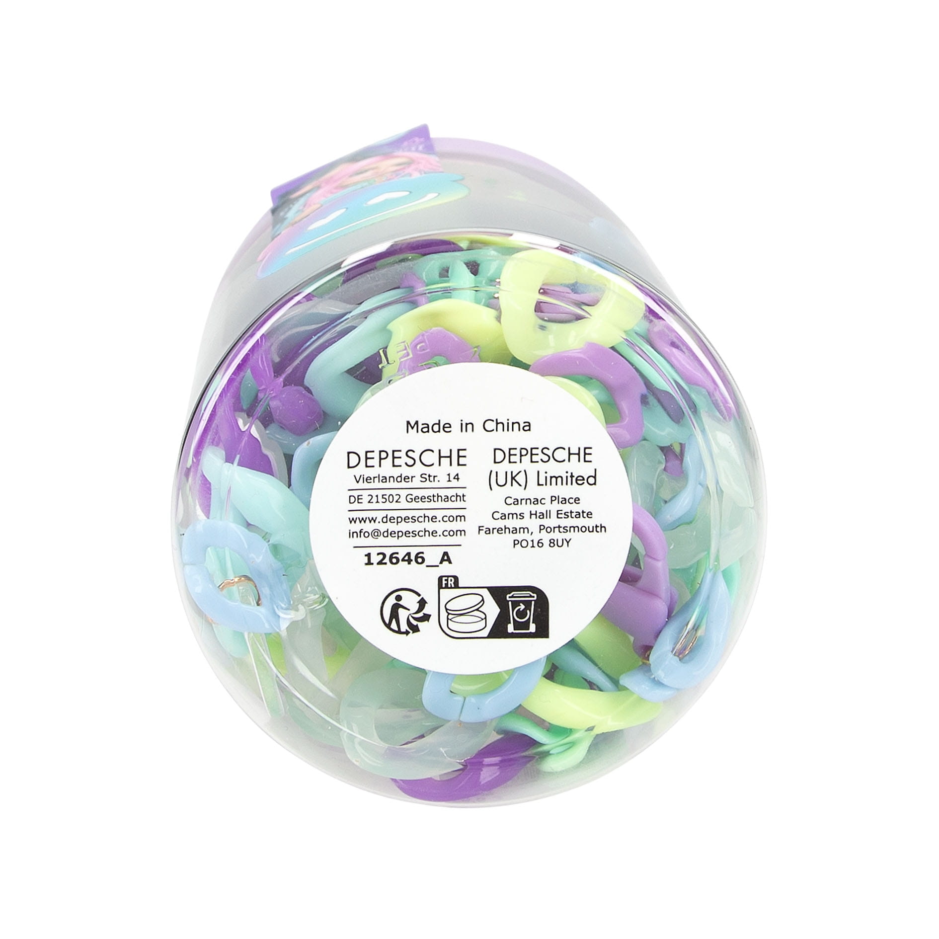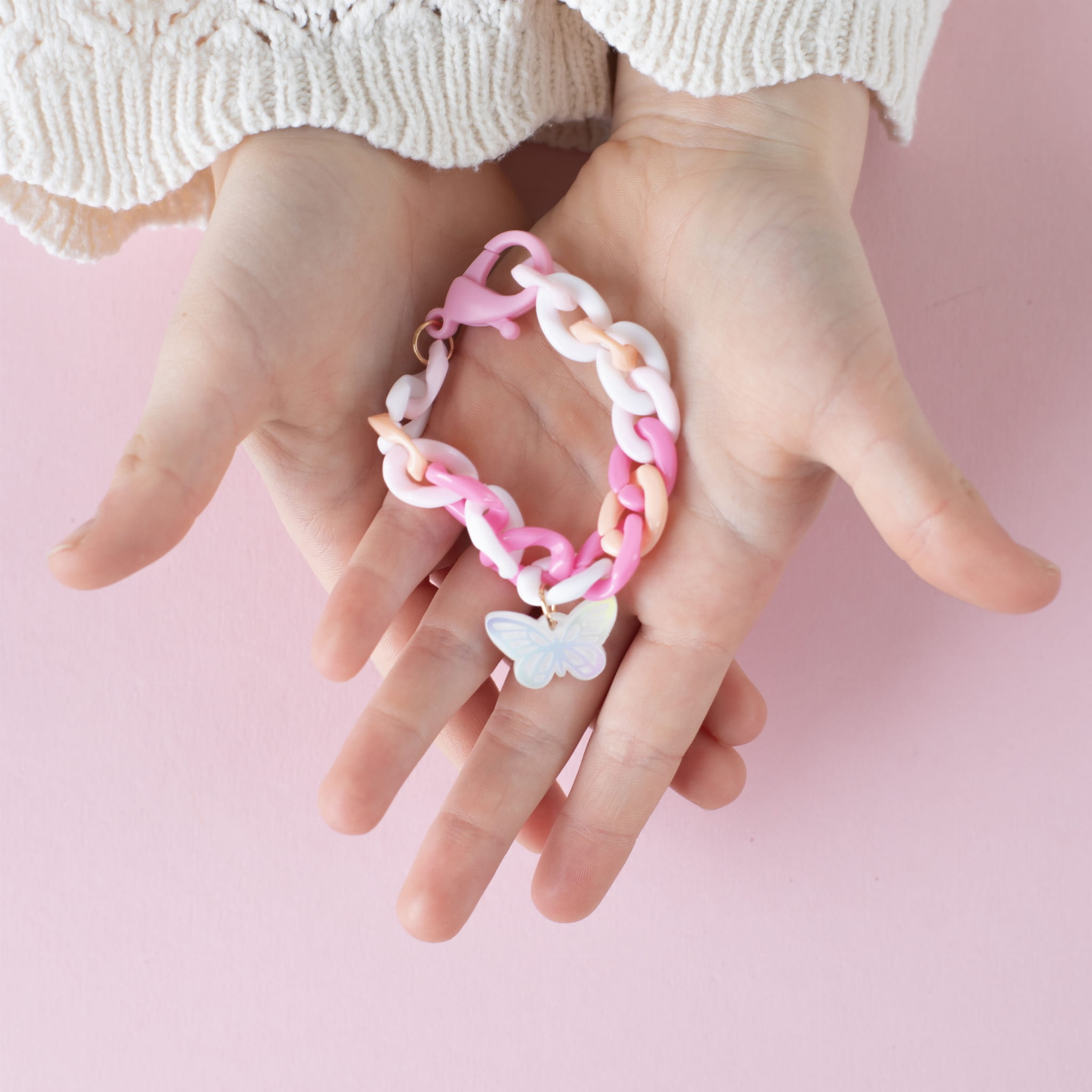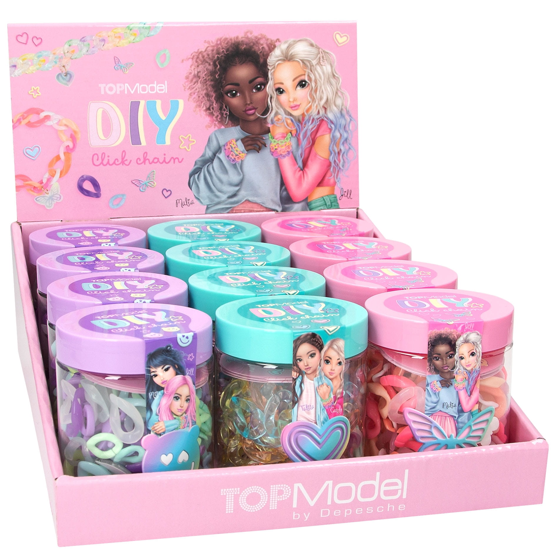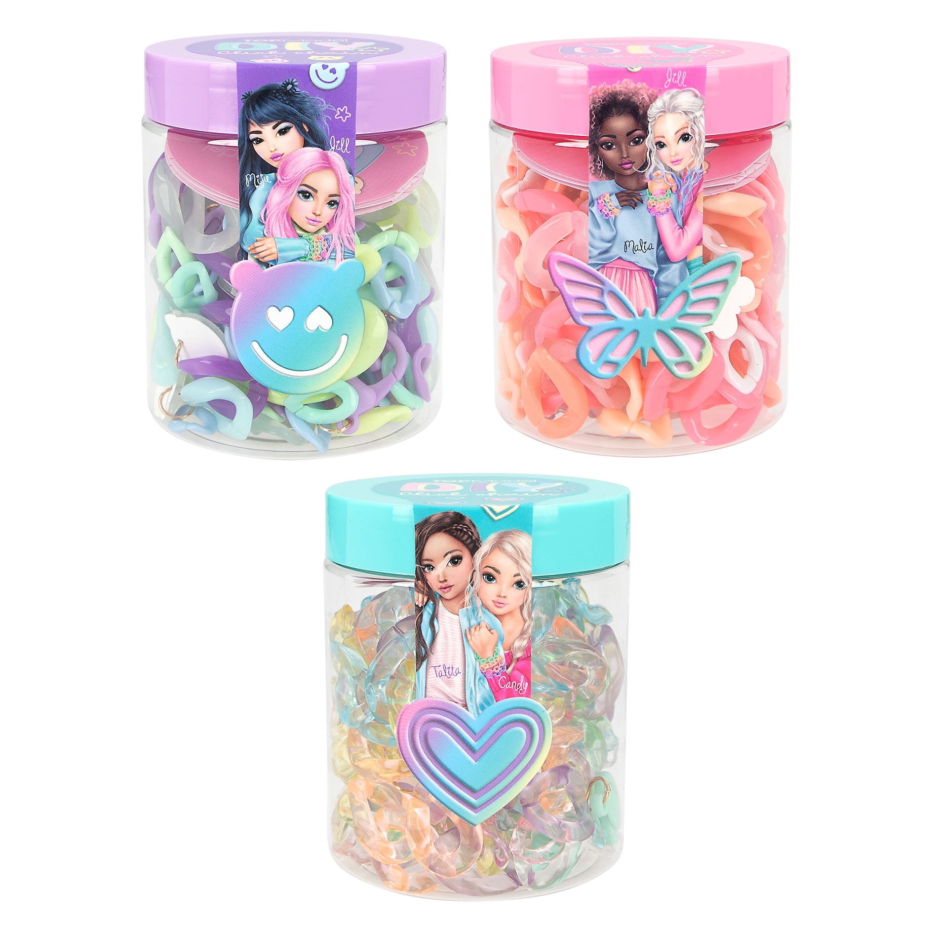 Klick-klick-schick! Durch einfaches Zusammenstecken der bunten Kettenglieder, entstehen angesagte Schmuckstücke. Jedes Set besteht aus Kettengliedern in zwei Größen (100 große Elemente, 100 kleine Elemente), 6 Karabinern, 4 niedlichen Anhängern und einer bebilderten DIY-Anleitung. 3 verschiede Designs: Lila mit Bärchen-Anhänger, Türkis mit Herzchen-Anhänger und Pink mit Schmetterlings-Anhänger.