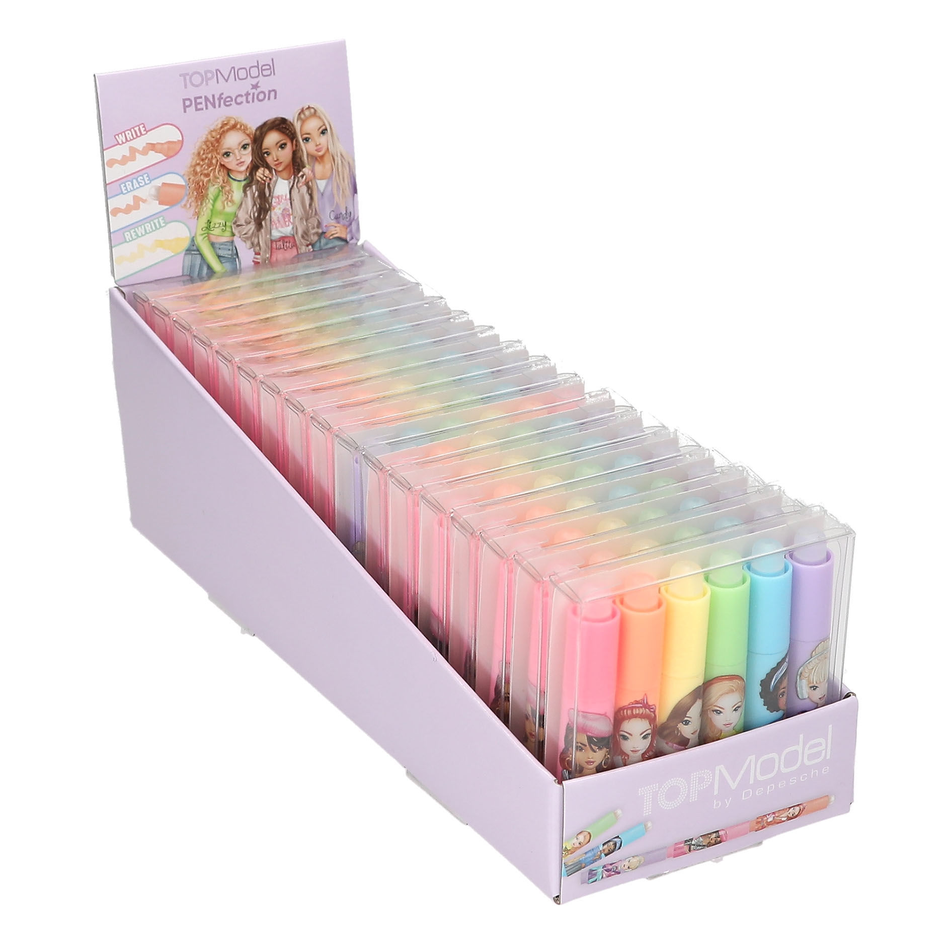 Die Mini-Highlighter von TOPModel sind im wahrsten Sinne des Wortes ein Highlight: Sie lassen sich ganz einfach mit der runden Spitzer der Kappe wieder wegradieren. 6 verschiedene Farben: Rosa, Orange, Gelb, Blau, Grün, Lila. Mit jeweils einem coolen TOPModel-Print auf dem Stift. Die kleinen Stifte lassen sich zusammenstecken.