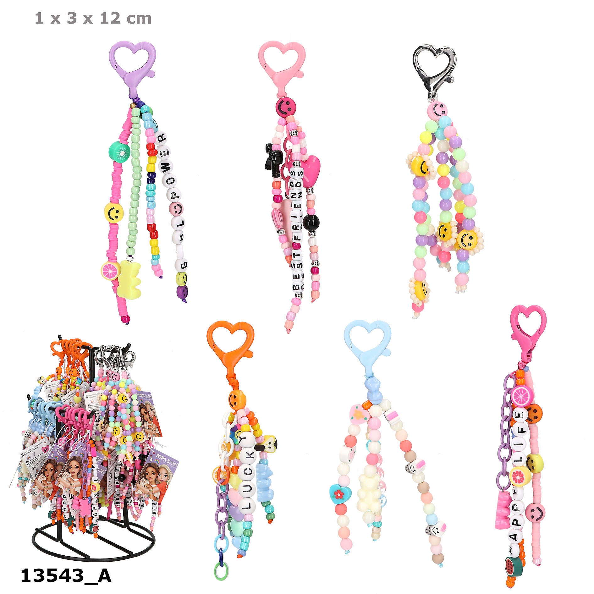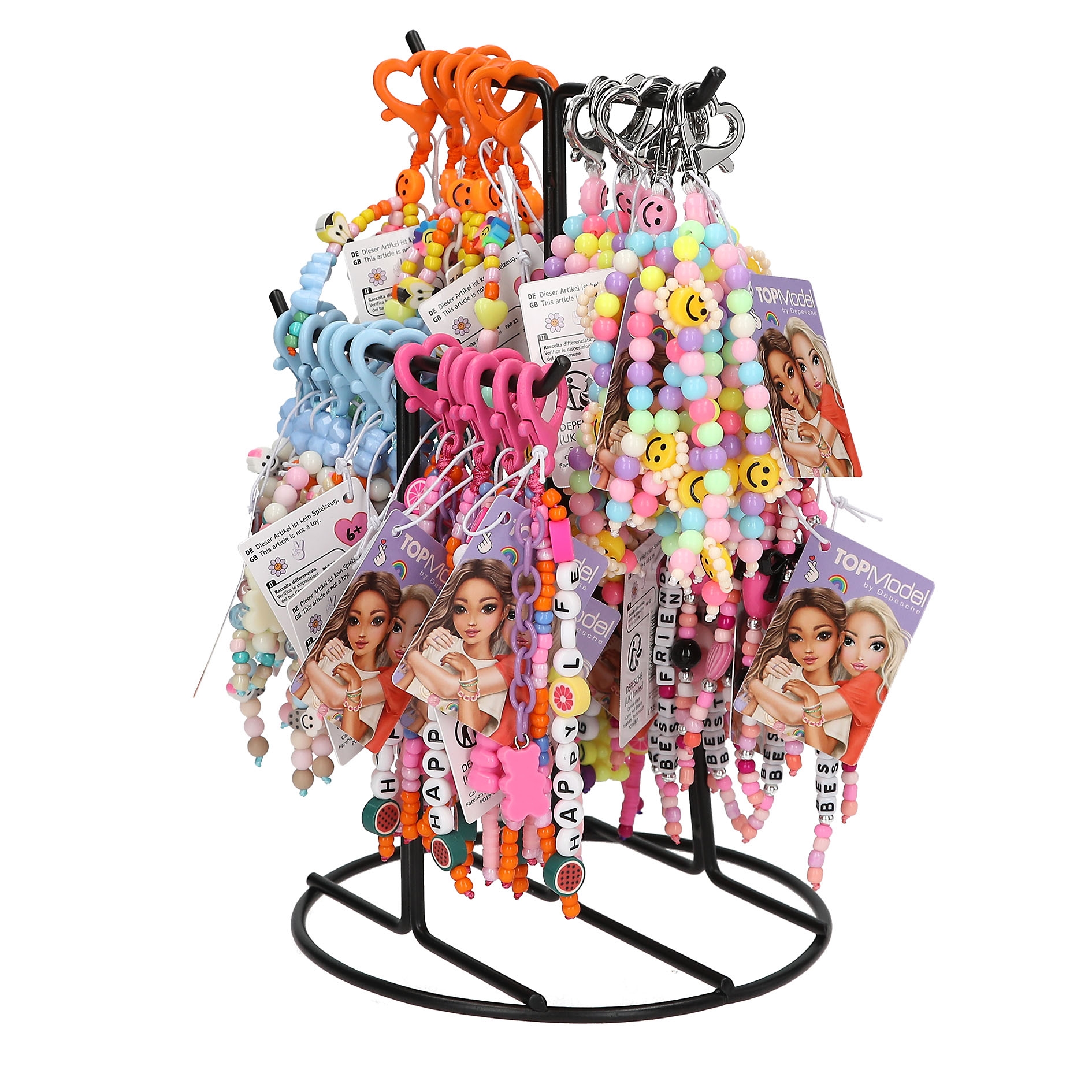 100 Prozent Hingucker: Die supercoolen TOPModel-Anhänger aus kunterbunten Perlen mit Herz-Karabiner pimpen jede Tasche oder den Schlüsselbund. 6 verschiedene Designs mit süßen figürlichen Perlen und (teilweise) Buchstaben-Perlen. Echte Trend-Teile!