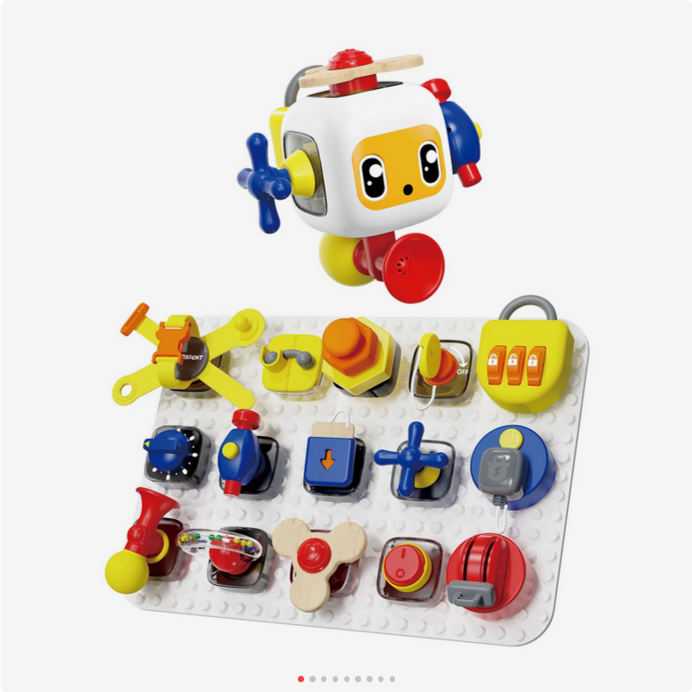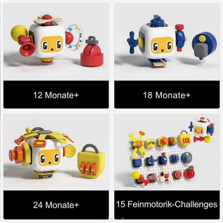 Mit dem Busy Board Entdecker Set gehen Kleinkinder auf Entdeckungstour: Das spaßige Set besteht aus einem kleinen Würfel, einem Steckbrett und 15 spannenden Gadgets, die Eltern und Kinder entweder auf den Würfel oder das Brett stecken können. Ob verschiedene Schlösser zum Knacken, eine lustige Hupe oder unterschiedliche Knöpfe zum Drücken oder Drehen – es gibt jede Menge zum Greifen, Stecken und Erkunden! Ganz nebenbei trainieren Kids beim Spielen ihre Feinmotorik, die Hand-Augen-Koordination sowie die Konzentration und das logische Denken.