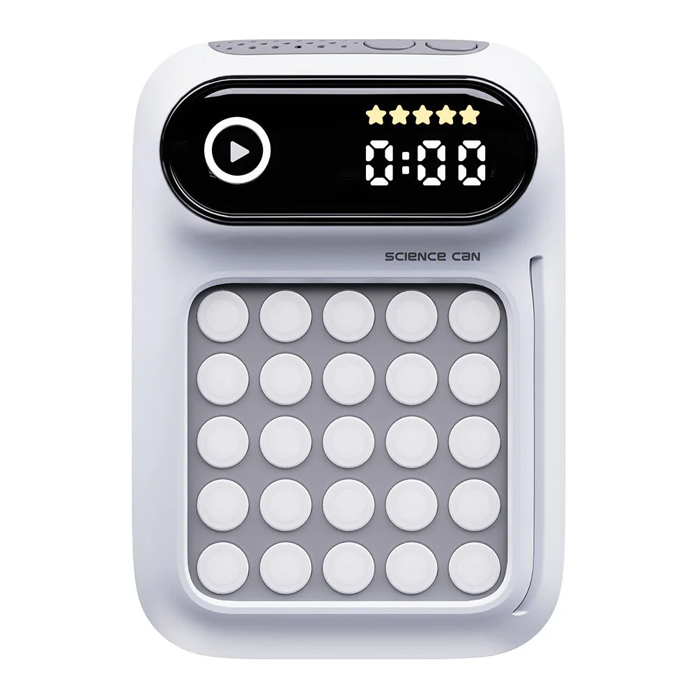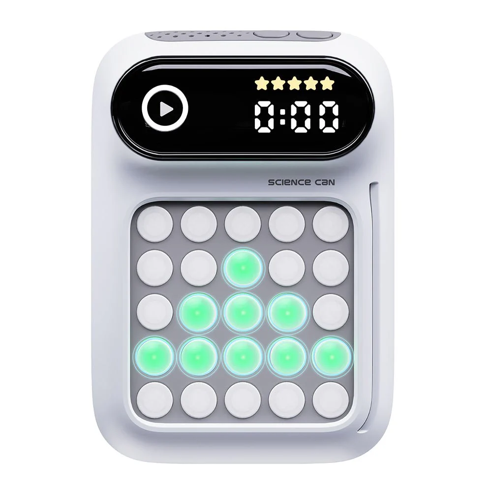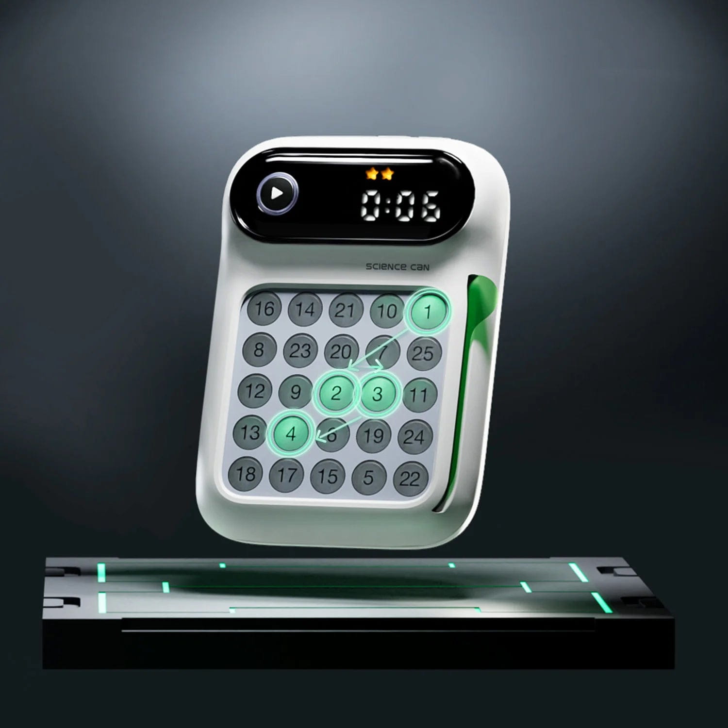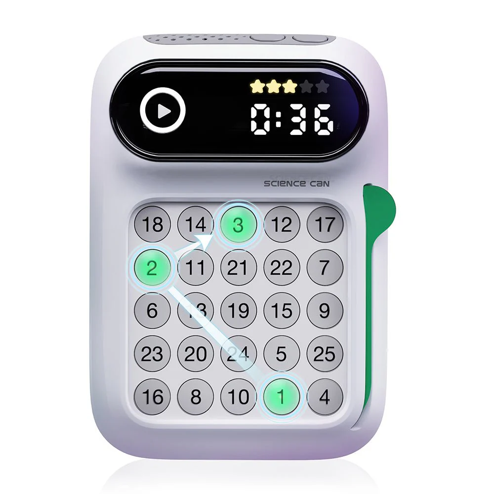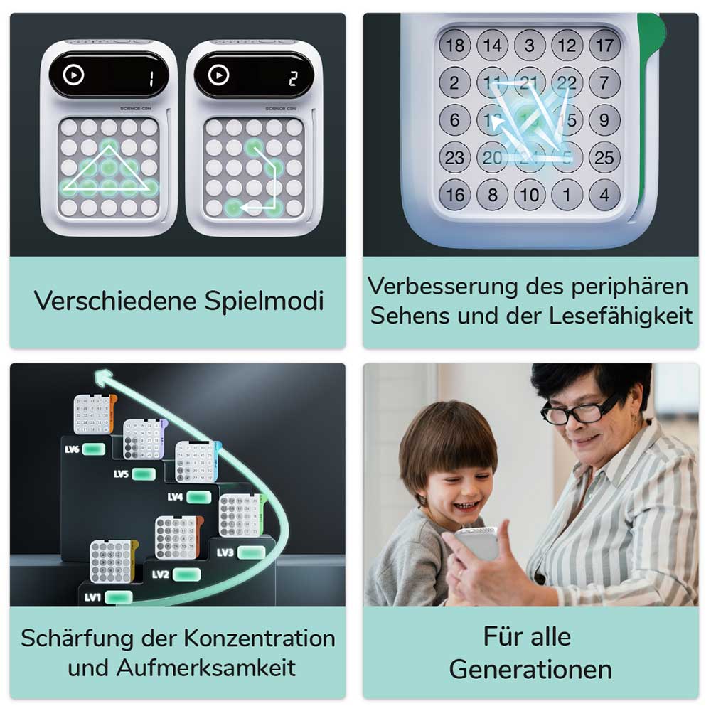„Ich schaffe es in 8 Sekunden! Und du?“ Mit Gehirnjogging – Fit im Kopf trainieren Kinder ab 6 Jahren genauso wie Erwachsene spielerisch ihr Gedächtnis, ihre Konzentration, Aufmerksamkeit, Reaktionsfähigkeit und Lesegeschwindigkeit in einem – und das alles mit ganz viel Spaß. In vier unterschiedlichen Modi und verschiedenen Schwierigkeitsstufen steigern sie kontinuierlich ihre Fähigkeiten. Dabei wird bewusst auf eine Bildschirmauszeit gesetzt, um Screentime zu reduzieren und die Konzentration zu fokussieren. Mit verschieden schweren Schulte Tabellen nach Prof. Dr. Walter Schulte fördert der Schulte Modus das periphere Sehen und die Lesegeschwindigkeit. Dabei werden die Augen auf die Mitte der Tabelle gerichtet, ohne den Blick beim Spielen davon wegzubewegen. Hier drücken Trainierende Zahlen in der richtigen Reihenfolge vom kleinsten zum größten Wert. Beim Schulte Pro Modus gelten dieselben Regeln – allerdings gibt es hier keinen Ton und kein Licht für eine erhöhte Schwierigkeit. Der Modus „Sequenzielles Gedächtnis“ zeigt eine Lichtabfolge in einer bestimmten Reihenfolge. Die gilt es sich zu merken und dann in der richtigen Reihenfolge wiederzugeben. Beim Modus „Grafisches Gedächtnis“ wird die Fähigkeit trainiert, sich Muster zu merken. Nachdem die Lichter ein Muster gezeigt haben, geht es darum, die Grafik wieder herzustellen. Gegen sich selbst oder gegen andere – der kompakte Gehirntrainer für die ganze Familie lässt sich überall mit hinnehmen und spielen. Dabei dienen die Sounds des Trainers in den Modi Schulte, Sequenzielles Gedächtnis und Grafisches Gedächtnis der Konzentration und können nicht abgeschaltet werden.