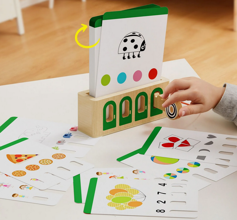 Die Karten haben unter jedem Lösungsvorschlag ein Loch, das mit den Öffnungen des Kastens übereinstimmt.