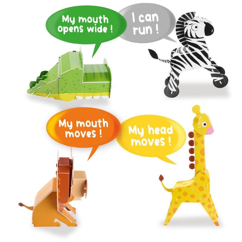 Dieser kinderleichte Steckbausatz funktioniert ganz ohne Kleber oder Schere! In 10–30 Minuten entstehen bewegliche Tiere mit verschiedenen Funktionen: Maul öffnen, Kopf nicken, Beine bewegen. Jede Figur besteht aus 11–21 Teilen. Material: papierkaschierter EPS-Schaum. Für Kinder ab 4 Jahren geeignet.
