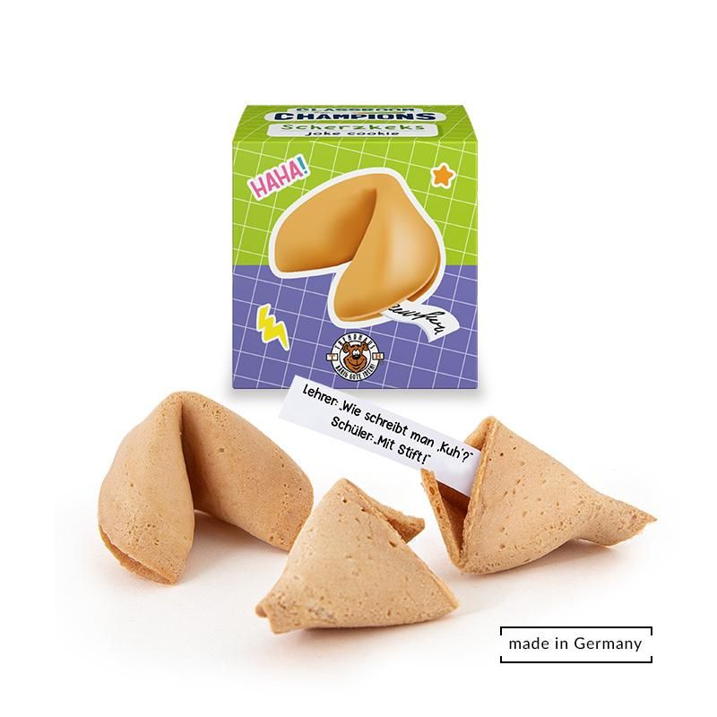 Knuspern & Kichern! Dieser Glückskeks (Weizengebäck, 6g) für die Schule enthält einen von 6 lustigen Schülerwitzen (deutsch & englisch) – Made in Germany! Perfekt als kleine Überraschung, Belohnung oder Pausen-Gag und verpackt in einer lustigen Geschenkbox!