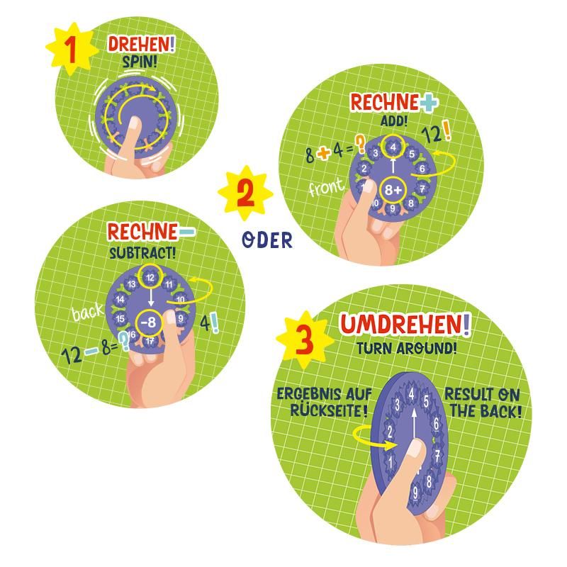Interaktives Lernen kombiniert mit Spielspaß! Addiere oder subtrahiere ganz einfach die Zahlen auf den Rädern. Das jeweilige Ergebnis findest du auf der Rückseite. So ist der Lernerfolg garantiert!