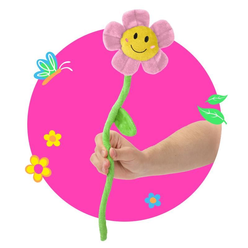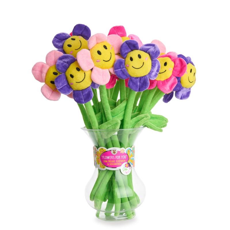 Diese farbenfrohe Plüschblume mit lachendem Gesicht bringt sofort gute Laune – ob als Deko, Geschenk oder kleines Mitbringsel. Der biegsame Stiel macht sie vielseitig einsetzbar. Gesamtlänge: ca. 39 cm. Geliefert in dekorativer Kunsstoffvase mit Banderole inkl. Silberfolien-Veredelung.