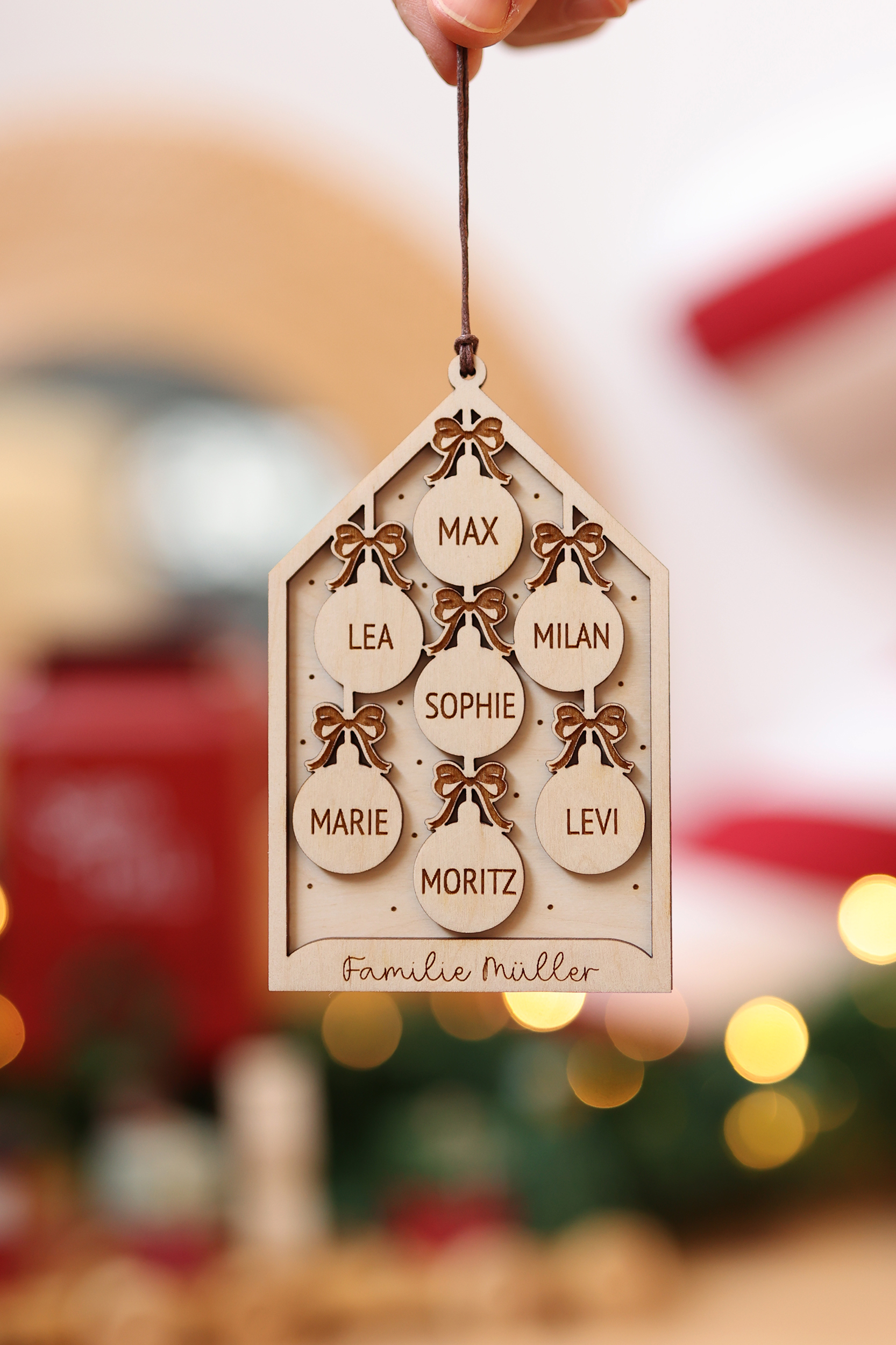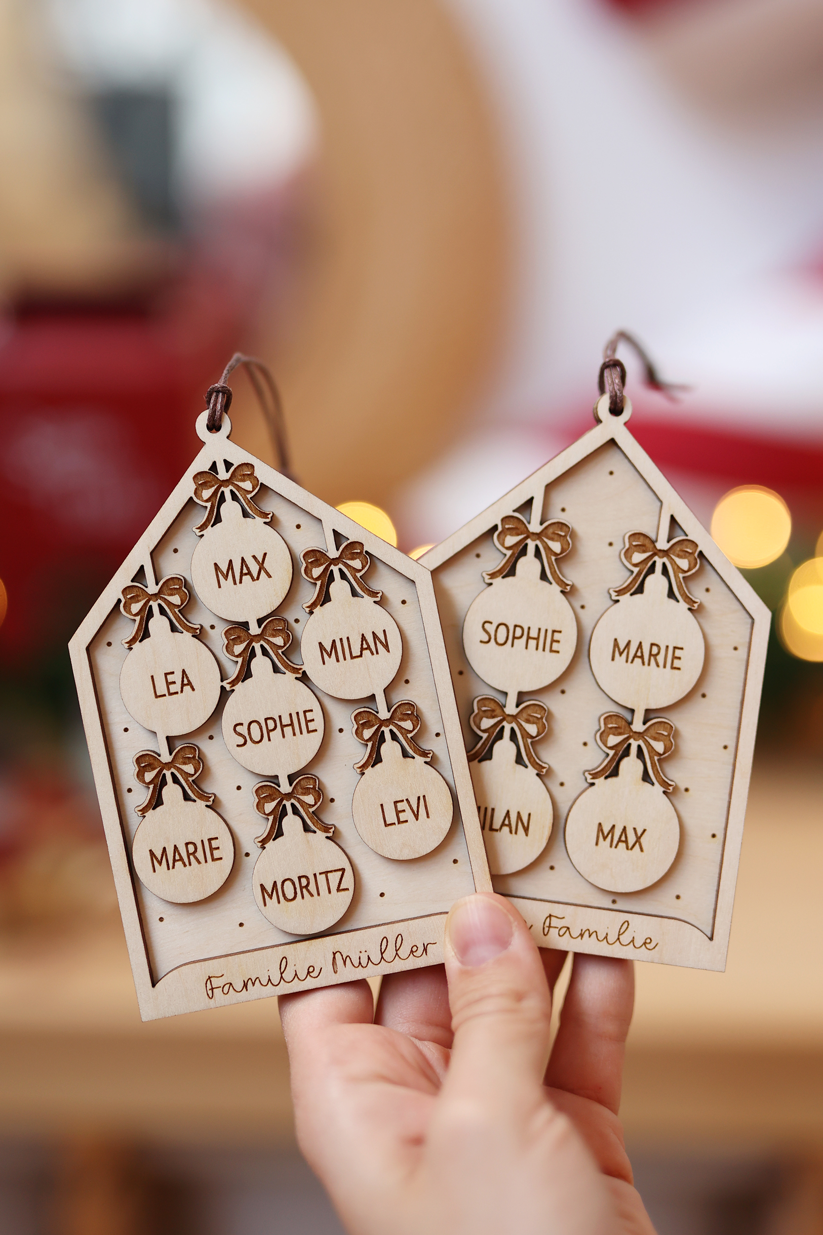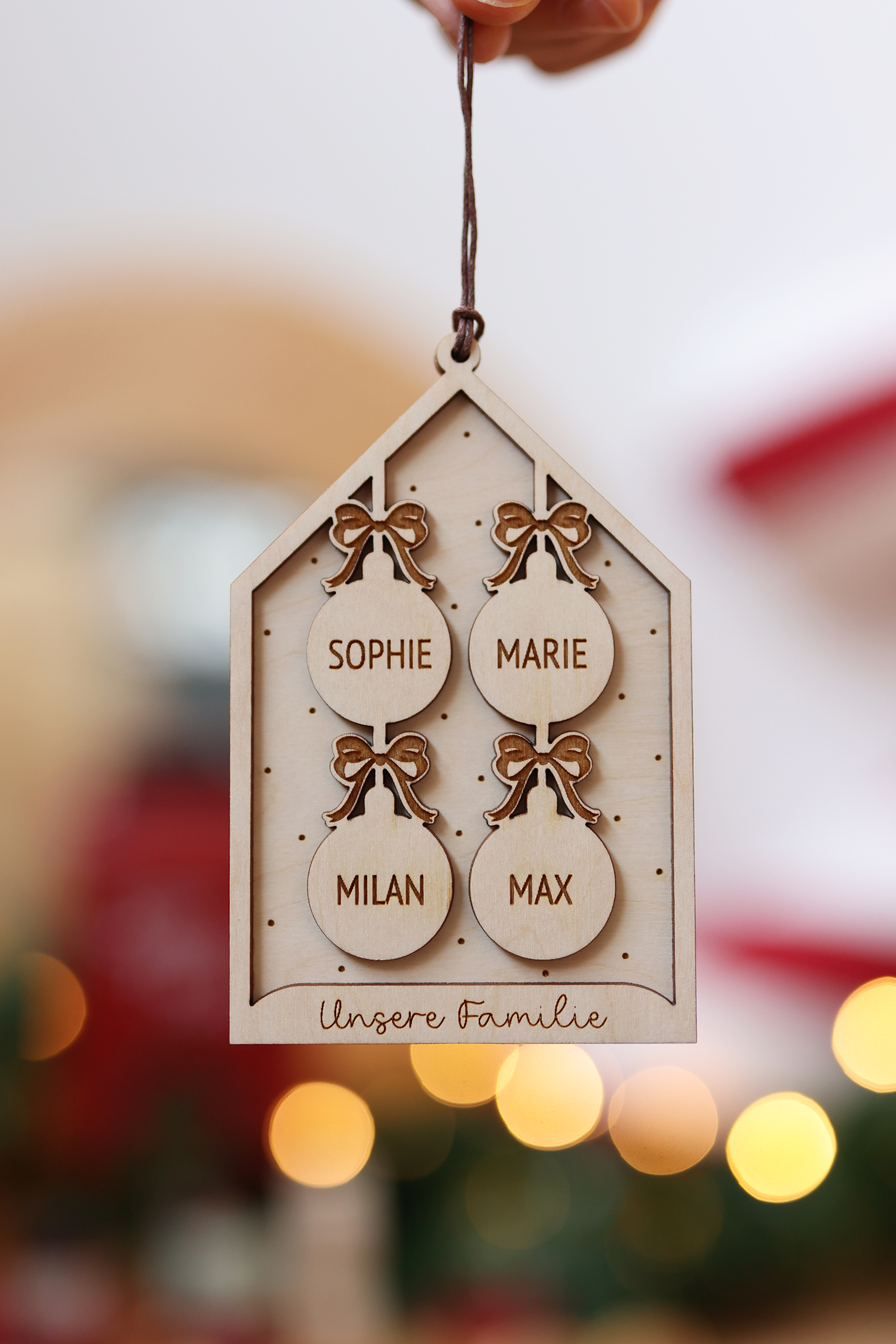 Gefertigt aus hochwertiger Birkenholz-Sperrplatte, zeigt das Ornament kleine Anhänger mit den Namen deiner Liebsten – von 2 bis zu 7 Namen möglich.