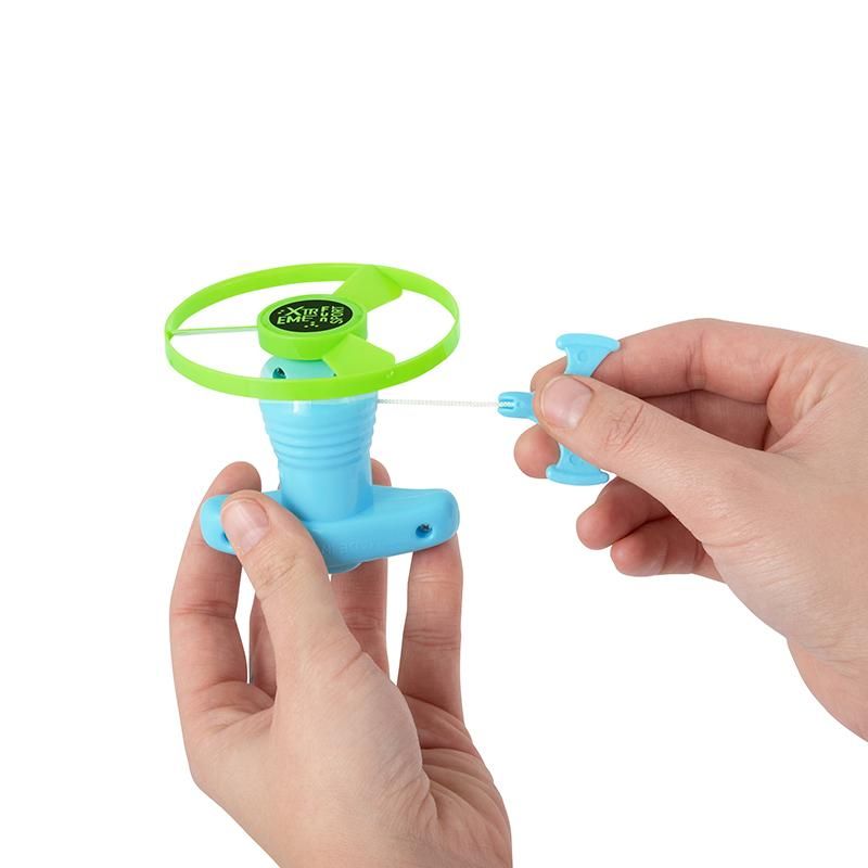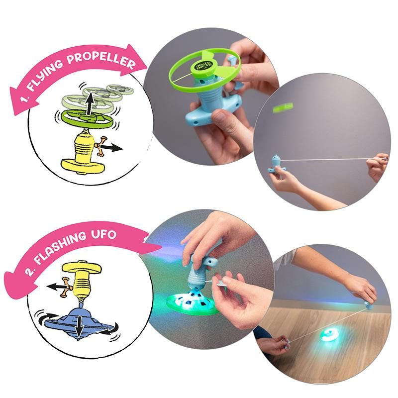 Ein Set - zwei coole Spielmöglichkeiten für Groß und Klein! Spiel 1 - Flying Propeller: Stecke einen Propeller auf und lass durch die Luft fliegen indem du die Schnur für maximale Drehgeschwindigkeit ziehst. Spiel 2 - Flashing Ufo: Lass das Leuchtufo über den Boden sausen - einfach unten auf den Griff stecken und Schnur ziehen.
