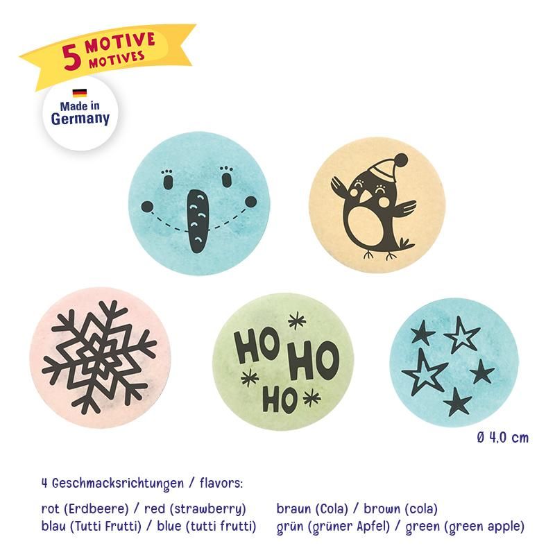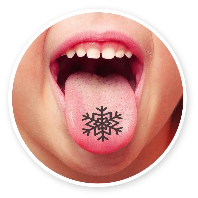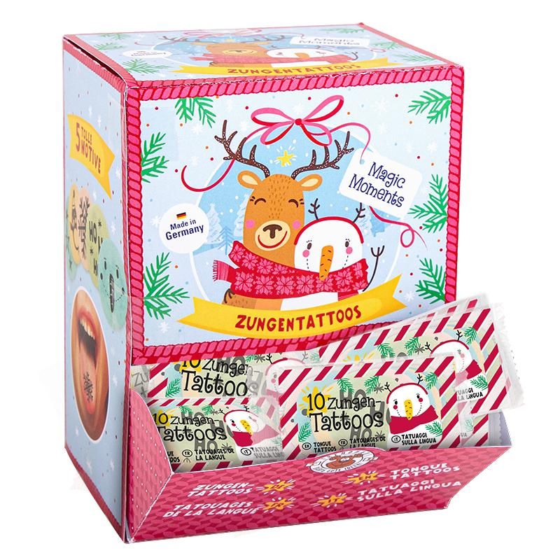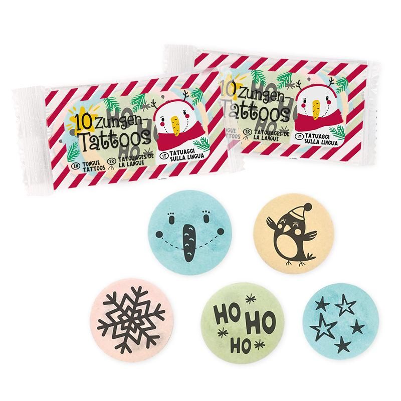 Zunge raus und drauf – ein süßes Highlight für die Winterzeit! Die leckeren Taler aus Esspapier schmecken nicht nur gut, sondern sind zugleich auch coole Zungentattoos mit tollen Motiven. Einfach Zunge rausstrecken, Tattoo auflegen und kurz andrücken, wieder wegnehmen und Spaß haben. Je Beutel 10 Zungentattoos: Durchmesser ca. 4,0 cm.
